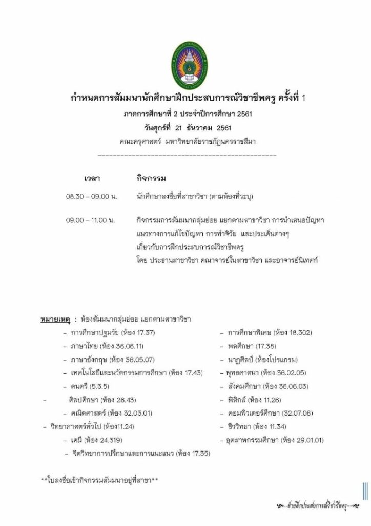 กำหนดจัดสัมมนา นักศึกษาฝึกประสบการณ์สอนวิชาชีพครู ชั้นปีที่ 5 เทอม 2/2561 หลักสูตรครุศาสตรบัณฑิต สาขาวิชาพุทธศาสนศึกษา ครั้งที่ 1 ให้กับนักศึกษาฝึกประสบการณ์สอนวิชาชีพครู โดยกำหนดจัดสัมมนา ณ อาคาร 36 ห้อง 36.02.05 วันศุกร์ที่ 21 ธันวาคม 2561 เวลา 09.00น. เป็นต้นไป เพื่อนักศึกษาร่วมแลกเปลี่ยนประสบการณ์จากการฝึกสอนของนักศึกษาสาขาวิชาพุทธศาสนศึกษา โดยกำหนดหัวข้อในการสัมมนาคือ