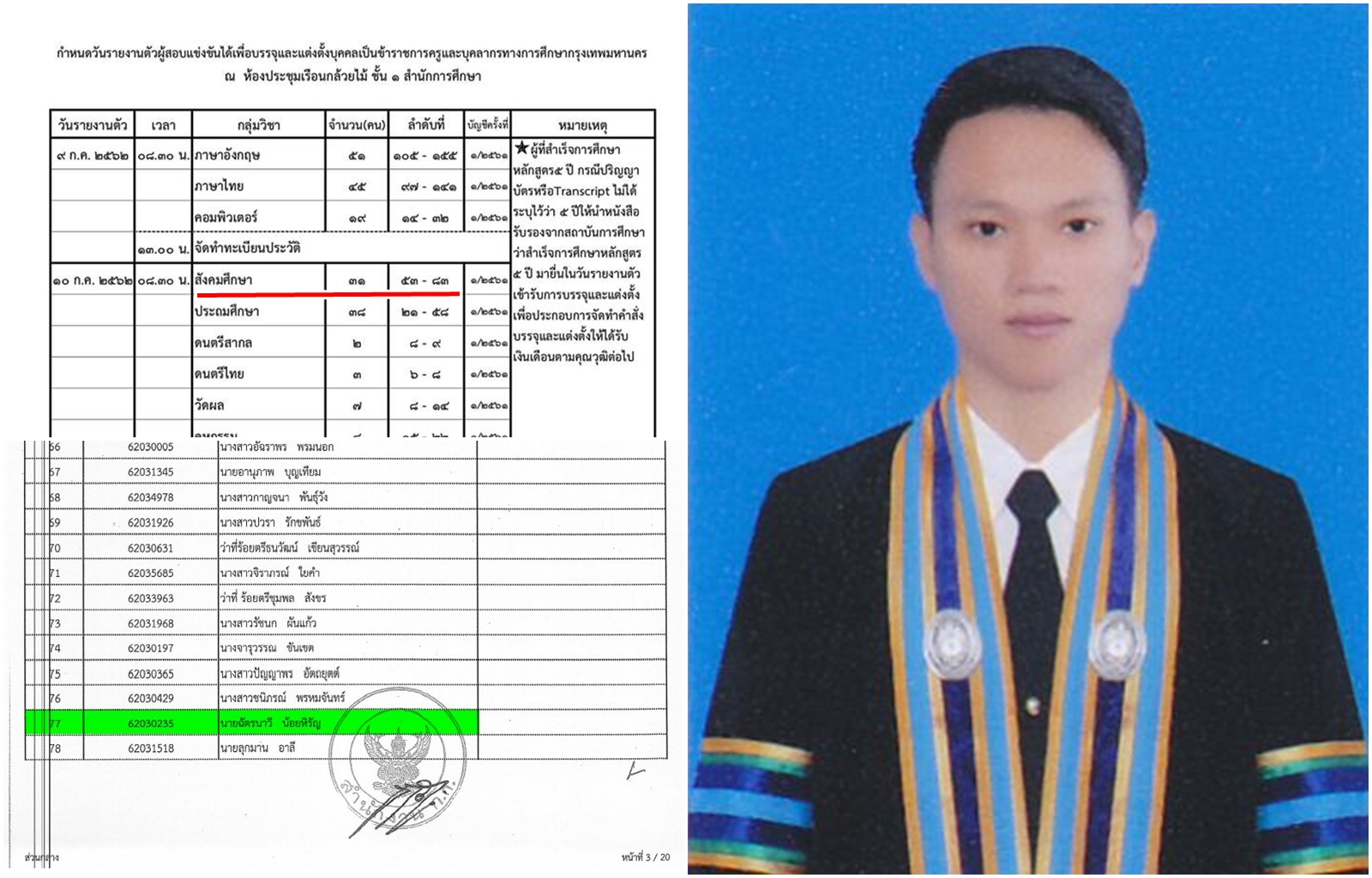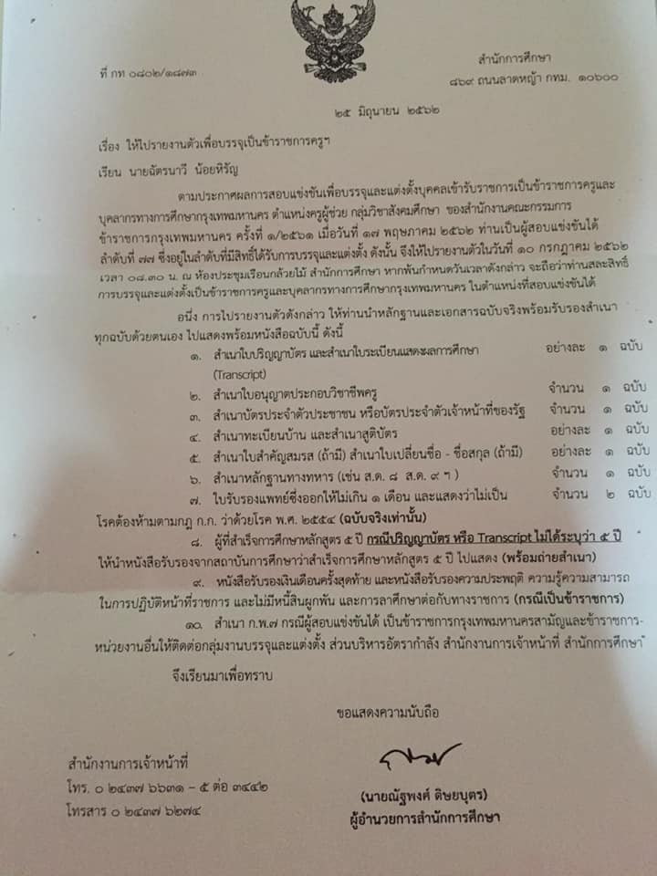 ตามที่มีประกาศสำนักงานคณะกรรมการข้าราชการกรุงเทพมหานคร เรื่อง รายชื่อผู้สมัครสอบแข่งขันเพื่อบรรจุและแต่งตั้งบุคคลเข้ารับราชการเป็นข้าราชการครูและบุคลากรทางการศึกษากรุงเทพมหานคร ตำแหน่งครูผู้ช่วย ครั้งที่ 1/2561 และมีการสอบแข่งขันเพื่อบรรจุผู้ทีสอบผ่านเข้ารับราชการเมื่อช่วงวันที่ 30 – 31 มีนาคม 2562 และมีการสอบสัมภาษณ์ในวันที่ 11 พฤษภาคม 2562 ที่ผ่านมา ในส่วนของศิษย์เก่าหลักสูตรครุศาสตรบัณฑิต สาขาวิชาพุทธศาสนศึกษานั้น มีผู้ที่สามารถสอบผ่านขึ้นบัญชี ในกลุ่มวิชาสังคมศึกษา จำนวน 4 คน ตามที่เคยประกาศไปแล้วนั้น บัดนี้สำนักงานคณะกรรมการข้าราชการกรุงเทพมหานครจะมีการเรียกบรรจุผู้สอบแข่งขันได้มารายงานตัวเพื่อบรรจุแต่งตั้งเป็นข้าราชการครูและบุคลากรทางการศึกษากรุงเทพมหานคร ตำแหน่งครูผู้ช่วย ครั้งที่ 2 ปี พ.ศ.2561 โดยมีผู้ที่ได้บรรจุเป็นข้าราชการครูที่เป็นศิษย์เก่าของสาขาวิชาพุทธศาสนศึกษา ในตำแหน่งครูผู้ช่วย คือ นายฉัตรนาวี น้อยหิรัญ กำหนดรายงานตัววันที่ 10 กรกฎาคม 2562 ที่จะถึงนี้