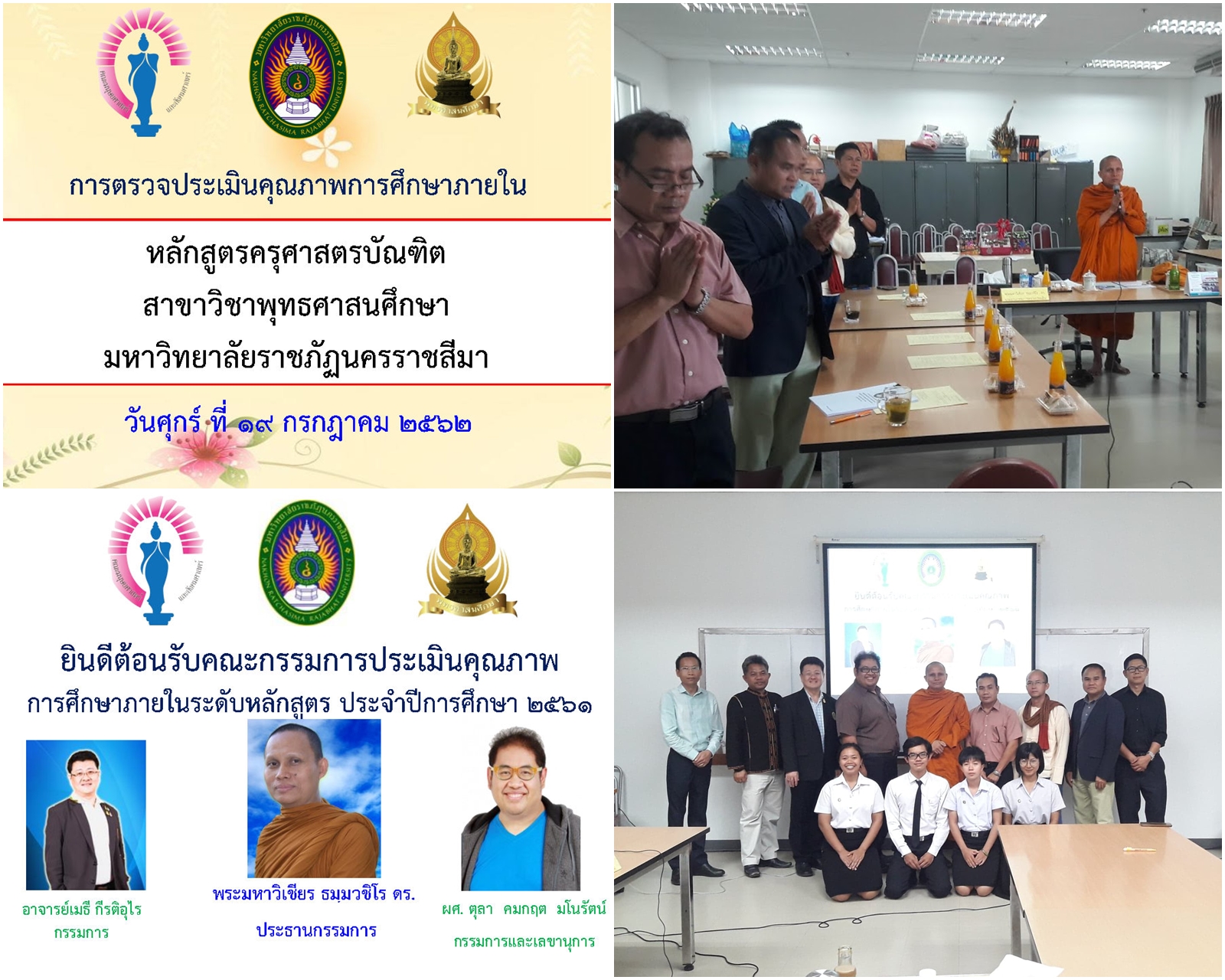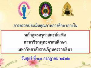 โดยในส่วนของหลักสูตรครุศาสตรบัณฑิต สาขาวิชาพุทธศาสนศึกษา การตรวจประเมินคุณภาพการศึกษา ใช้ห้อง 36.07.10 อาคารคณะมนุษยศาสตร์และสังคมศาสตร์ ซึ่งมี พระมหาวิเชียร ธมฺมวชิโร ดร. ผู้ทรงคุณวุฒิจากมหาวิทยาลัยมหามกุฏราชวิทยาลัย เป็นประธานกรรมการ อาจารย์เมธี กีรติอุไร คณะวิทยาการจัดการ มหาวิทยาลัยราชภัฏนครราชสีมา เป็นกรรมการ และ ผศ.ตุลา คมกฤต มโนรัตน์ คณะมนุษยศาสตร์และสังคมศาสตร์ มหาวิทยาลัยราชภัฏนครราชสีมา เป็นกรรมการและเลขานุการ ซึ่งการตรวจประเมินคุณภาพการศึกษาภายในระดับหลักสูตรเป็นไปด้วยความเรียบร้อย โดยคณะกรรมการตรวจประเมินคุณภาพการศึกษาภายในหลักสูตร ได้แจ้งคะแนนในเบื้องต้นของหลักสูตรครุศาสตรบัณฑิต สาขาวิชาพุทธศาสนศึกษาได้ 3.28 จากคะแนนเต็ม 5.00 โดยมีระยะเวลาในการปรับแก้ตามคำแนะนำของคณะกรรมการภายใน 14 วัน เพื่อส่งเล่มสมบูรณ์ต่อไป