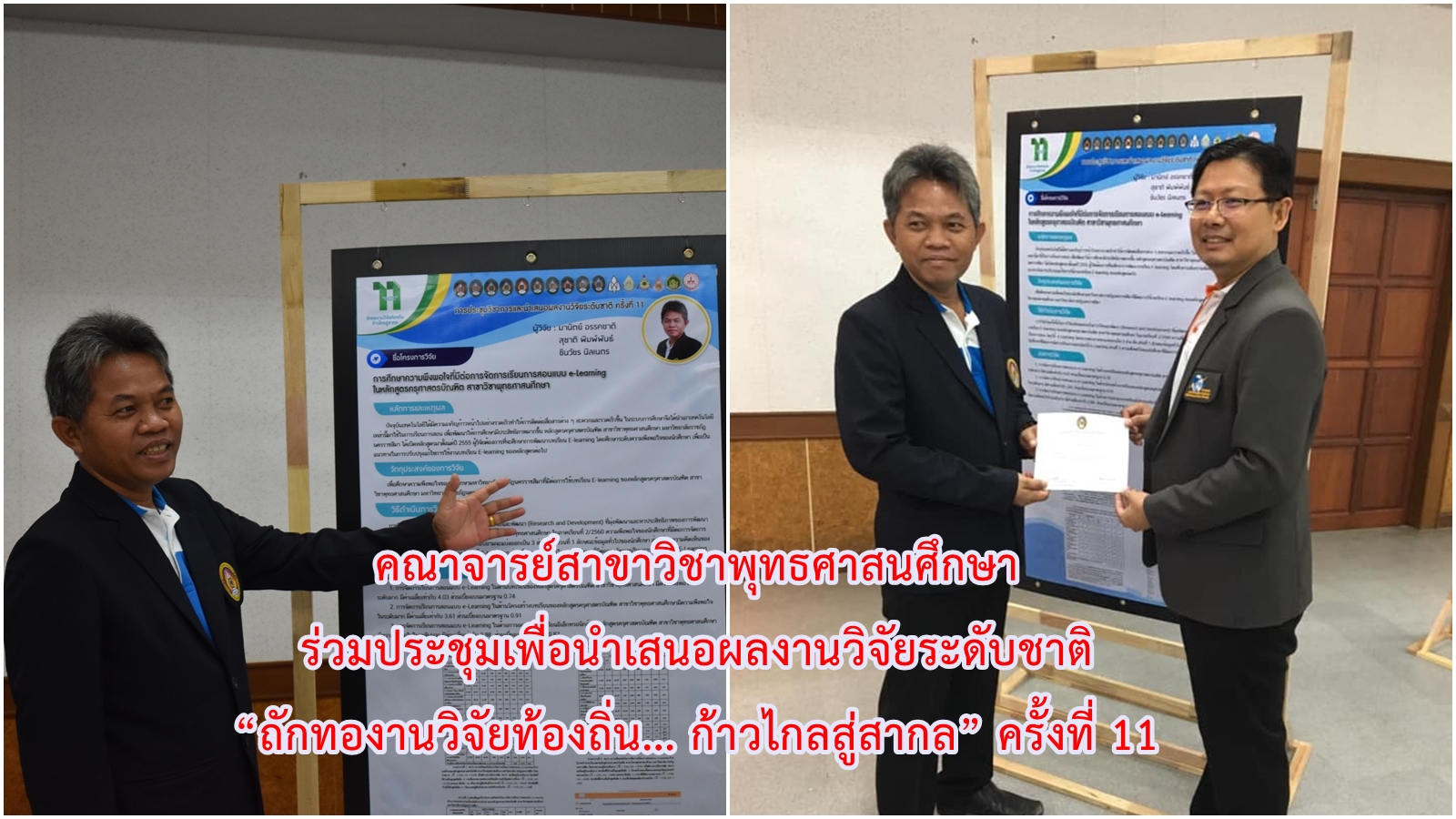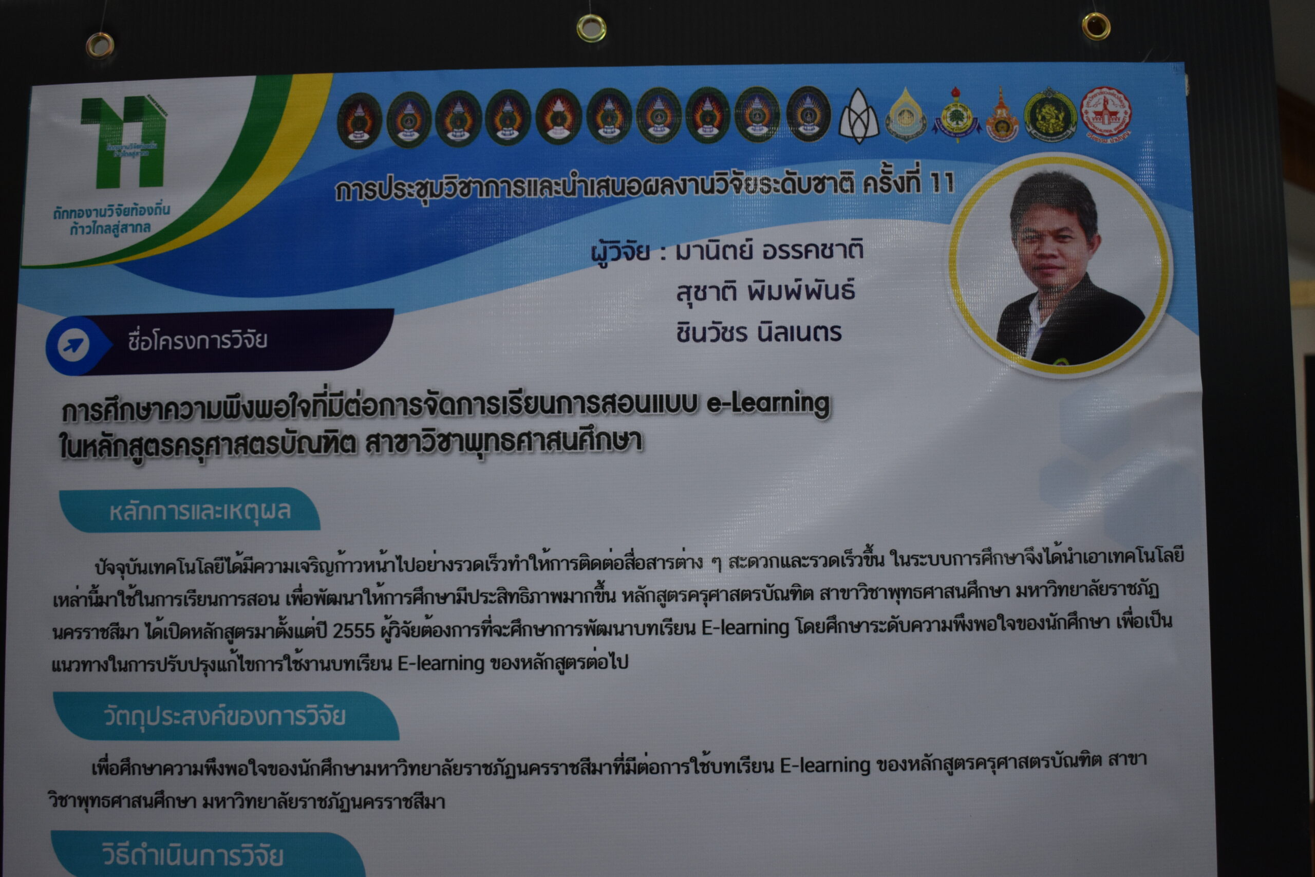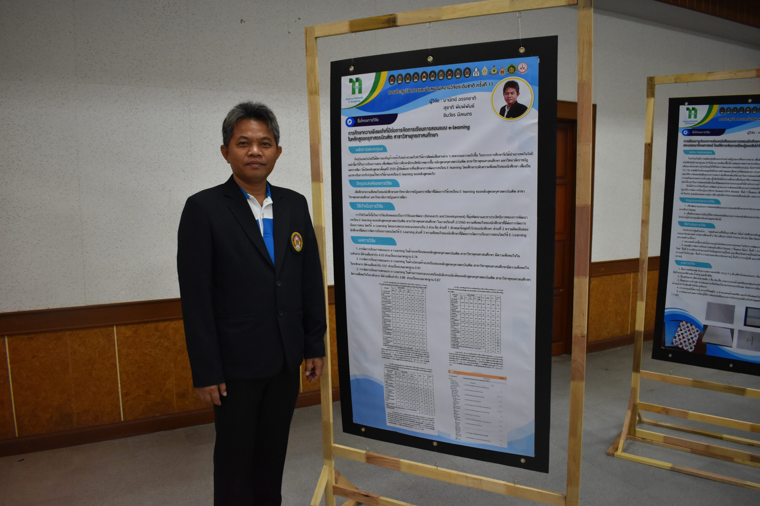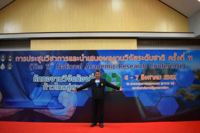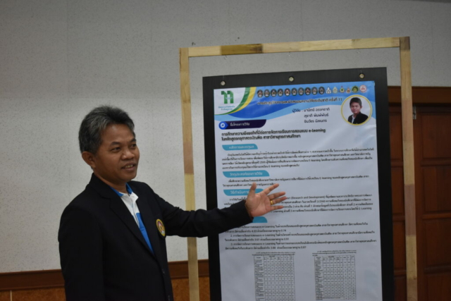 วันที่ 6 – 7 สิงหาคม 2562 อาจารย์มานิตย์ อรรคชาติ อาจารย์ประจำหลักสูตรครุศาสตรบัณฑิต สาขาวิชาพุทธศาสนศึกษา ได้เข้าร่วมการประชุมวิชาการและนำเสนอผลงานวิจัยระดับชาติ ครั้งที่ 11 ประจำปี 2562 ก “ถักทองานวิจัยท้องถิ่น…..ก้าวไกลสู่สากล” (The 11th National Academic Research Conference : Connecting Local Research to International Perspectives) โดยความร่วมมือระหว่างมหาวิทยาลัยราชภัฏนครราชสีมากับเครือข่ายมหาวิทยาลัยทั่วประเทศ และภาคีเครือข่ายในพื้นที่จังหวัดนครราชสีมา ในวันที่ 6 – 7 สิงหาคม 2562 ณ มหาวิทยาลัยราชภัฏนครราชสีมา โดยในวันที่ 7 สิงหาคม 2562 นั้นเป็นลำดับการนำเสนอของอาจารย์มานิตย์ อรรคชาติ ที่ได้นำเสนอผลงานวิจัยเป็นโปสเตอร์ ในเรื่องการศึกษาความพึงพอใจที่มีต่อการจัดการเรียนการสอนแบบ e-Learning ในหลักสูตรครุศาสตรบัณฑิต สาขาวิชาพุทธศาสนศึกษา A study of satisfaction e-Learning in Bachelor Degree of Education Program in Buddhist Studies โดยมีรศ.ดร.เอกรัตน์ เอกศาสตร์ รองผู้อำนวยการสถาบันวิจัยและพัฒนา มหาวิทยาลัยราชภัฏนครราชสีมา เป็นกรรมการผู้ทรงคุณวุฒิประจำโปสเตอร์นำเสนอ ณ อาคารวิทยาการจัดการ อาคาร 22 โดยมีผู้นำเสนอโปสเตอร์ จำนวน 26 เรื่อง ซึ่งความรู้และประสบการณ์ที่ได้รับจากการเข้าร่วมการประชุมวิชาการในครั้งนี้จะนำมาใช้พัฒนาการเรียนการสอนของหลักสูตรในอนาคต