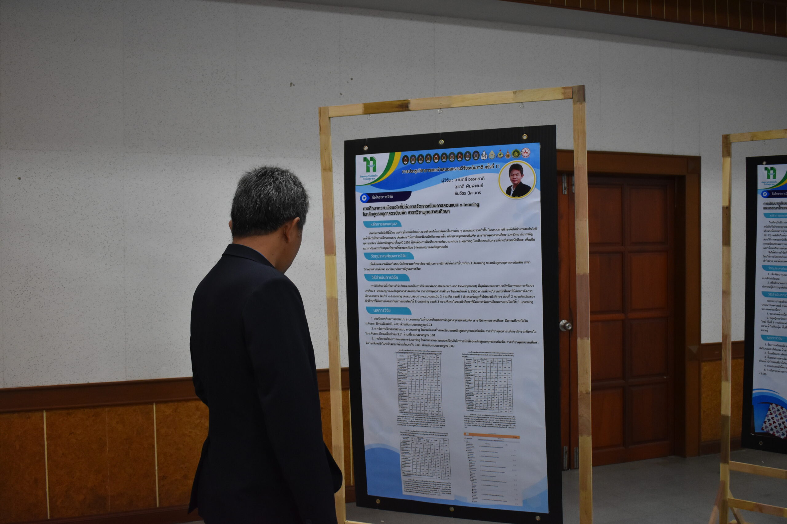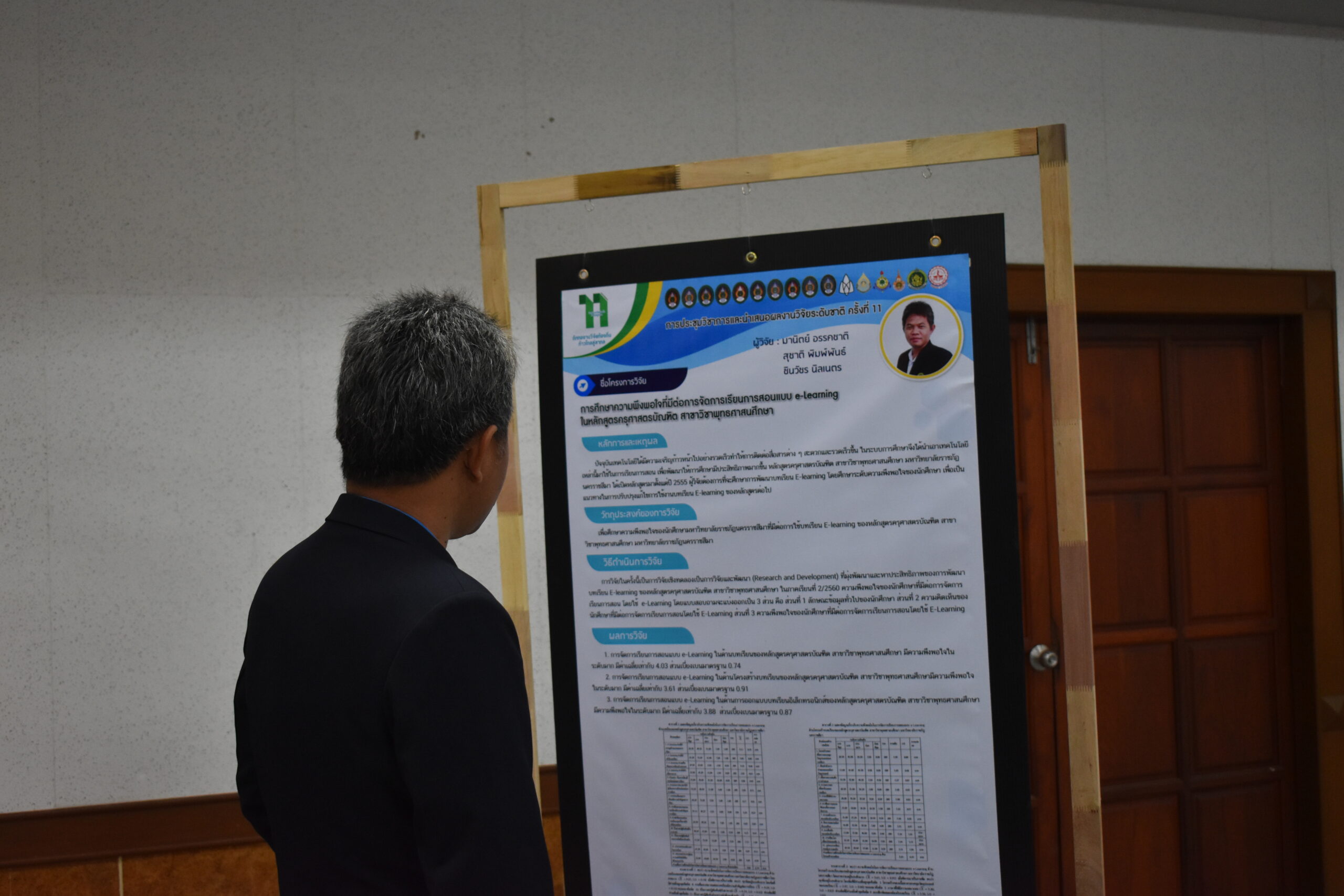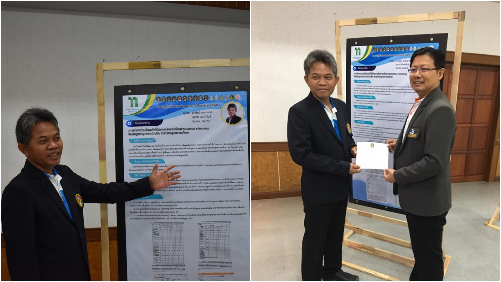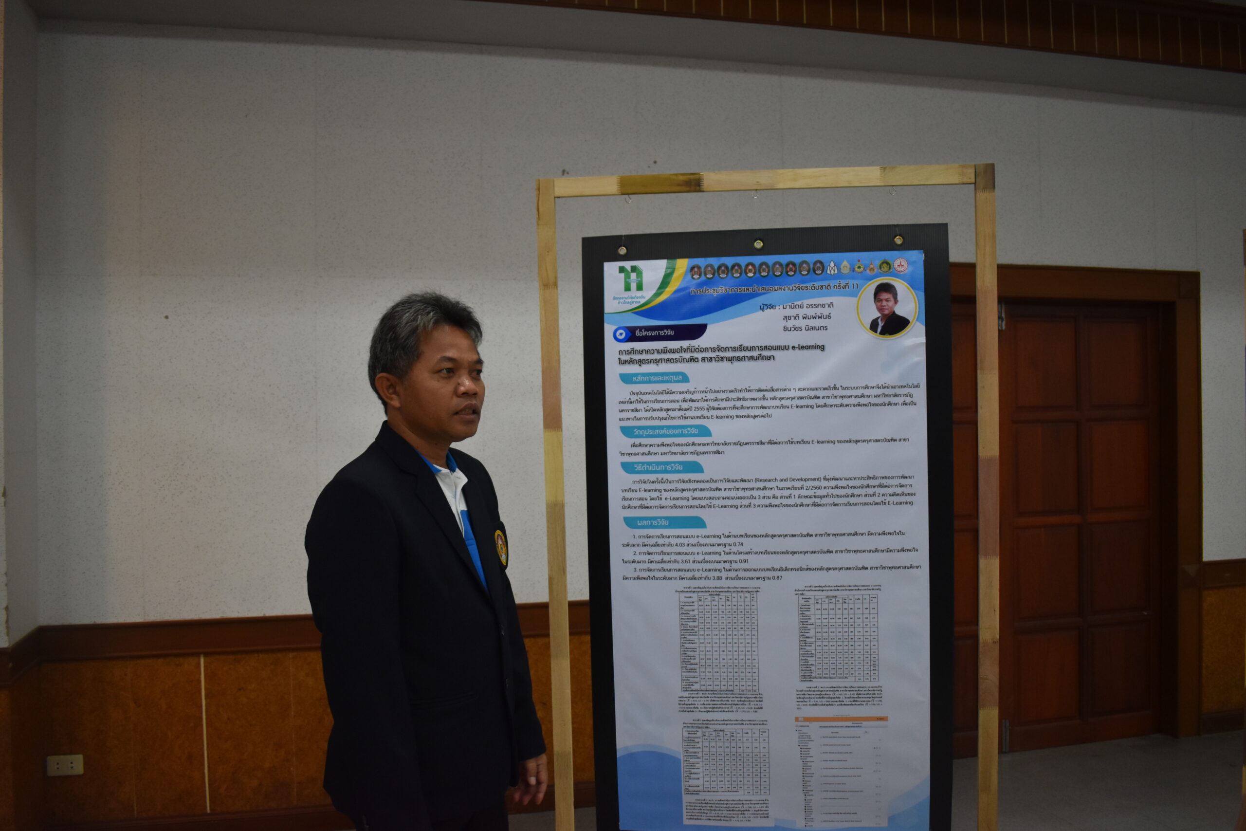 วันที่ 6 – 7 สิงหาคม 2562 อาจารย์มานิตย์ อรรคชาติ อาจารย์ประจำหลักสูตรครุศาสตรบัณฑิต สาขาวิชาพุทธศาสนศึกษา ได้เข้าร่วมการประชุมวิชาการและนำเสนอผลงานวิจัยระดับชาติ ครั้งที่ 11 ประจำปี 2562 ก “ถักทองานวิจัยท้องถิ่น…..ก้าวไกลสู่สากล” (The 11th National Academic Research Conference : Connecting Local Research to International Perspectives) โดยความร่วมมือระหว่างมหาวิทยาลัยราชภัฏนครราชสีมากับเครือข่ายมหาวิทยาลัยทั่วประเทศ และภาคีเครือข่ายในพื้นที่จังหวัดนครราชสีมา ในวันที่ 6 – 7 สิงหาคม 2562 ณ มหาวิทยาลัยราชภัฏนครราชสีมา โดยในวันที่ 7 สิงหาคม 2562 นั้นเป็นลำดับการนำเสนอของอาจารย์มานิตย์ อรรคชาติ ที่ได้นำเสนอผลงานวิจัยเป็นโปสเตอร์ ในเรื่องการศึกษาความพึงพอใจที่มีต่อการจัดการเรียนการสอนแบบ e-Learning ในหลักสูตรครุศาสตรบัณฑิต สาขาวิชาพุทธศาสนศึกษา A study of satisfaction e-Learning in Bachelor Degree of Education Program in Buddhist Studies โดยมีรศ.ดร.เอกรัตน์ เอกศาสตร์ รองผู้อำนวยการสถาบันวิจัยและพัฒนา มหาวิทยาลัยราชภัฏนครราชสีมา เป็นกรรมการผู้ทรงคุณวุฒิประจำโปสเตอร์นำเสนอ ณ อาคารวิทยาการจัดการ อาคาร 22 โดยมีผู้นำเสนอโปสเตอร์ จำนวน 26 เรื่อง ซึ่งความรู้และประสบการณ์ที่ได้รับจากการเข้าร่วมการประชุมวิชาการในครั้งนี้จะนำมาใช้พัฒนาการเรียนการสอนของหลักสูตรในอนาคต