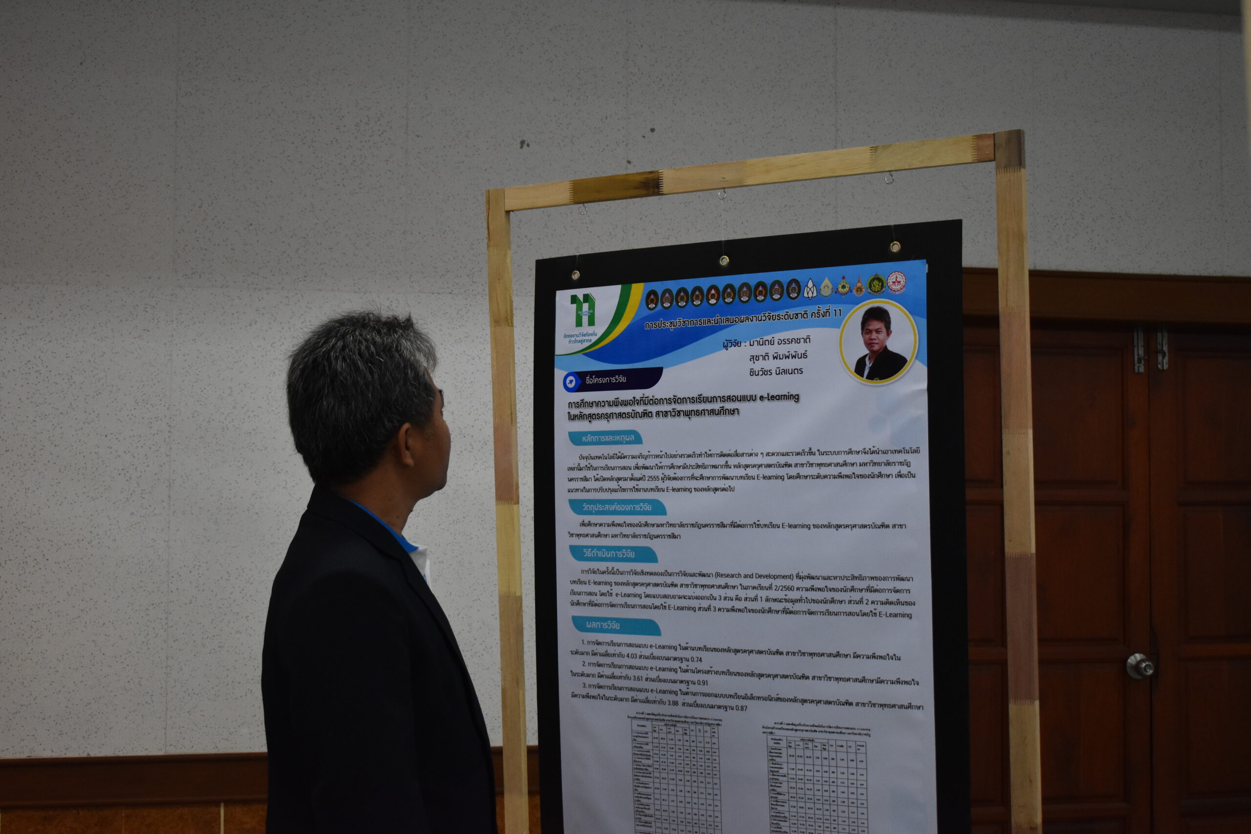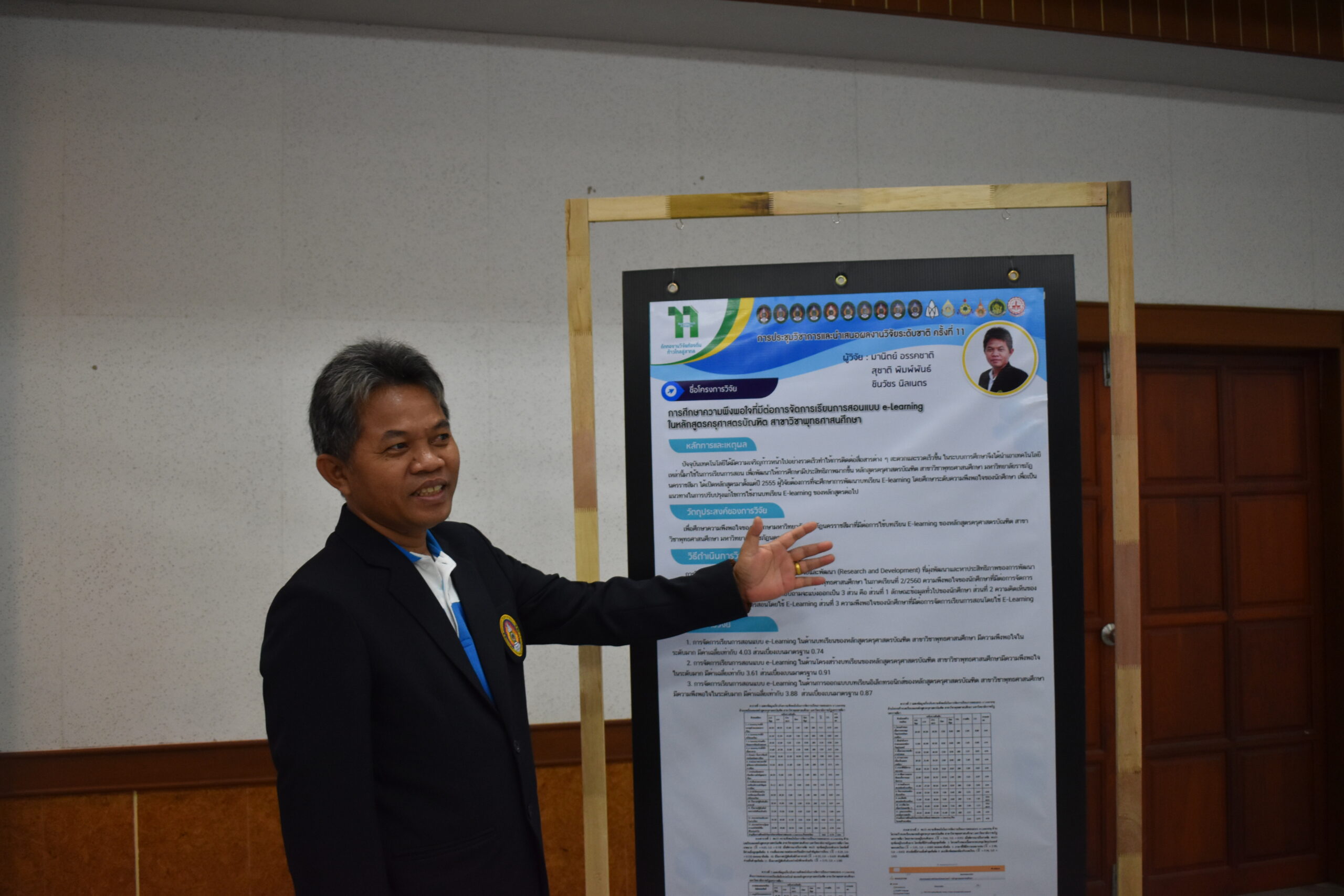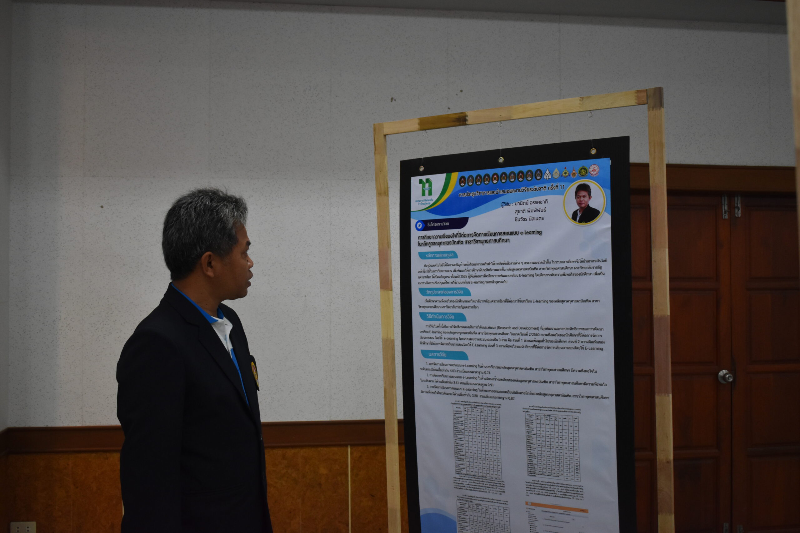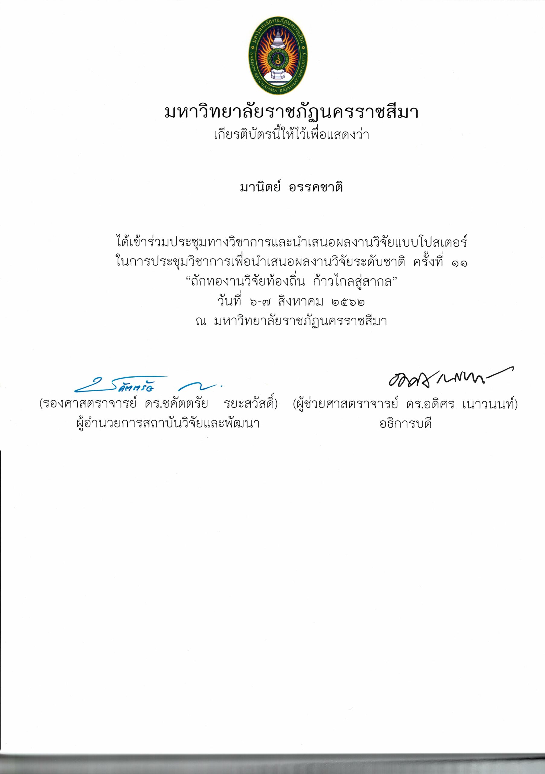 วันที่ 6 – 7 สิงหาคม 2562 อาจารย์มานิตย์ อรรคชาติ อาจารย์ประจำหลักสูตรครุศาสตรบัณฑิต สาขาวิชาพุทธศาสนศึกษา ได้เข้าร่วมการประชุมวิชาการและนำเสนอผลงานวิจัยระดับชาติ ครั้งที่ 11 ประจำปี 2562 ก “ถักทองานวิจัยท้องถิ่น…..ก้าวไกลสู่สากล” (The 11th National Academic Research Conference : Connecting Local Research to International Perspectives) โดยความร่วมมือระหว่างมหาวิทยาลัยราชภัฏนครราชสีมากับเครือข่ายมหาวิทยาลัยทั่วประเทศ และภาคีเครือข่ายในพื้นที่จังหวัดนครราชสีมา ในวันที่ 6 – 7 สิงหาคม 2562 ณ มหาวิทยาลัยราชภัฏนครราชสีมา โดยในวันที่ 7 สิงหาคม 2562 นั้นเป็นลำดับการนำเสนอของอาจารย์มานิตย์ อรรคชาติ ที่ได้นำเสนอผลงานวิจัยเป็นโปสเตอร์ ในเรื่องการศึกษาความพึงพอใจที่มีต่อการจัดการเรียนการสอนแบบ e-Learning ในหลักสูตรครุศาสตรบัณฑิต สาขาวิชาพุทธศาสนศึกษา A study of satisfaction e-Learning in Bachelor Degree of Education Program in Buddhist Studies โดยมีรศ.ดร.เอกรัตน์ เอกศาสตร์ รองผู้อำนวยการสถาบันวิจัยและพัฒนา มหาวิทยาลัยราชภัฏนครราชสีมา เป็นกรรมการผู้ทรงคุณวุฒิประจำโปสเตอร์นำเสนอ ณ อาคารวิทยาการจัดการ อาคาร 22 โดยมีผู้นำเสนอโปสเตอร์ จำนวน 26 เรื่อง ซึ่งความรู้และประสบการณ์ที่ได้รับจากการเข้าร่วมการประชุมวิชาการในครั้งนี้จะนำมาใช้พัฒนาการเรียนการสอนของหลักสูตรในอนาคต
