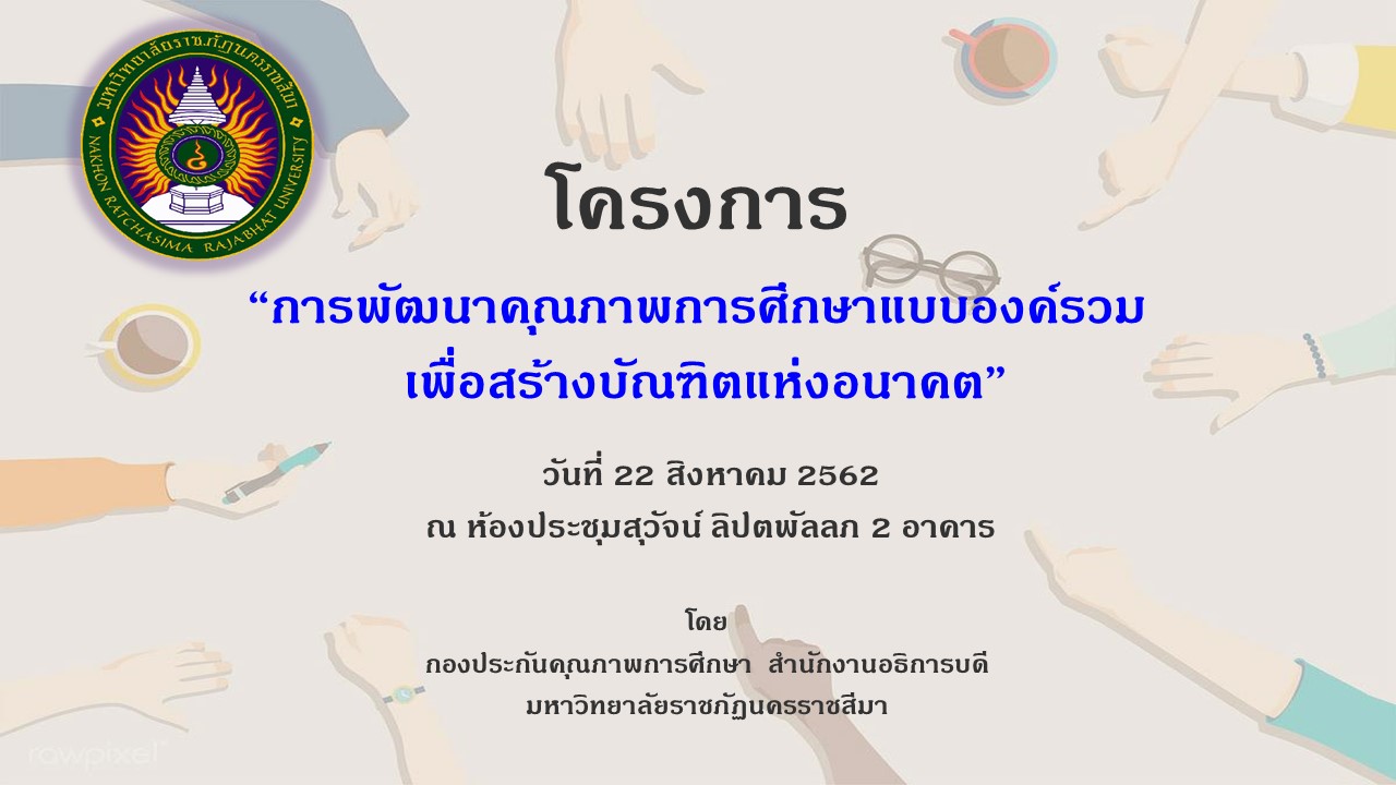เมื่อวันที่ 22 สิงหาคม 2562 ที่ผ่านมากองประกันคุณภาพการศึกษา มหาวิทยาลัยราชภัฏนครราชสีมาได้จัดทำโครงการพัฒนาคุณภาพการศึกษาแบบองค์รวมสร้างบัณฑิตแห่งอนาคต ณ ห้องประชุมสุวัจน์ ลิปตพัลลภ 2 อาคาร 31มหาวิทยาลัยราชภัฏนครราชสีมา ในพิธีเปิดได้รับเกียรติจาก ผู้ช่วยศาสตราจารย์ ดร.สุดาใจ โล่ห์วนิชชัย รองอธิการบดีฝ่ายวางแผนและงบประมาณ ได้ให้เกียรติมาเป็นประธานเปิดโครงการ การจัดโครงการในครั้งนี้เป็นการเตรียมความพร้อมด้านการพัฒนาบุคลากรในการสร้างบัณฑิตแห่งอนาคต ในบริบทด้านต่าง ๆ เพื่อให้คณาจารย์และบุคลากรของมหาวิทยาลัยราชภัฏนครราชสีมา ได้นำเอาหลักการและวิธีปฏิบัติมาปรับใช้ในการสร้างบัณฑิตให้เหมาะสม มีคุณค่า เพื่อให้ไปพัฒนาสังคมต่อไปได้ โดยการจัดโครงการแบ่งออกเป็น 2 รุ่นคือ วันที่ 22 สิงหาคม 2562 อบรมบุคลากรสายวิชาการ และวันที่ 23 สิงหาคม 2562 อบรมบุคลากรสายสนับสนุน