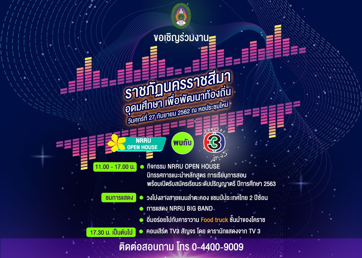 มหาวิทยาลัยราชภัฏนครราชสีมา ร่วมกับ คณะกรรมการส่งเสริมกิจการมหาวิทยาลัย และสถานีวิทยุโทรทัศน์ไทยทีวีสีช่อง 3 จะจัดคอนเสิร์ต TV 3 สัญจร ในโครงการ “ราชภัฏนครราชสีมา อุดมศึกษา เพื่อพัฒนาท้องถิ่น” ในวันศุกร์ที่ 27 กันยายน 2562 เวลา 17.00 น. เป็นต้นไป ณ หอประชุมใหม่ มหาวิทยาลัยราชภัฏนครราชสีมา เข้าชมฟรีตลอดงาน