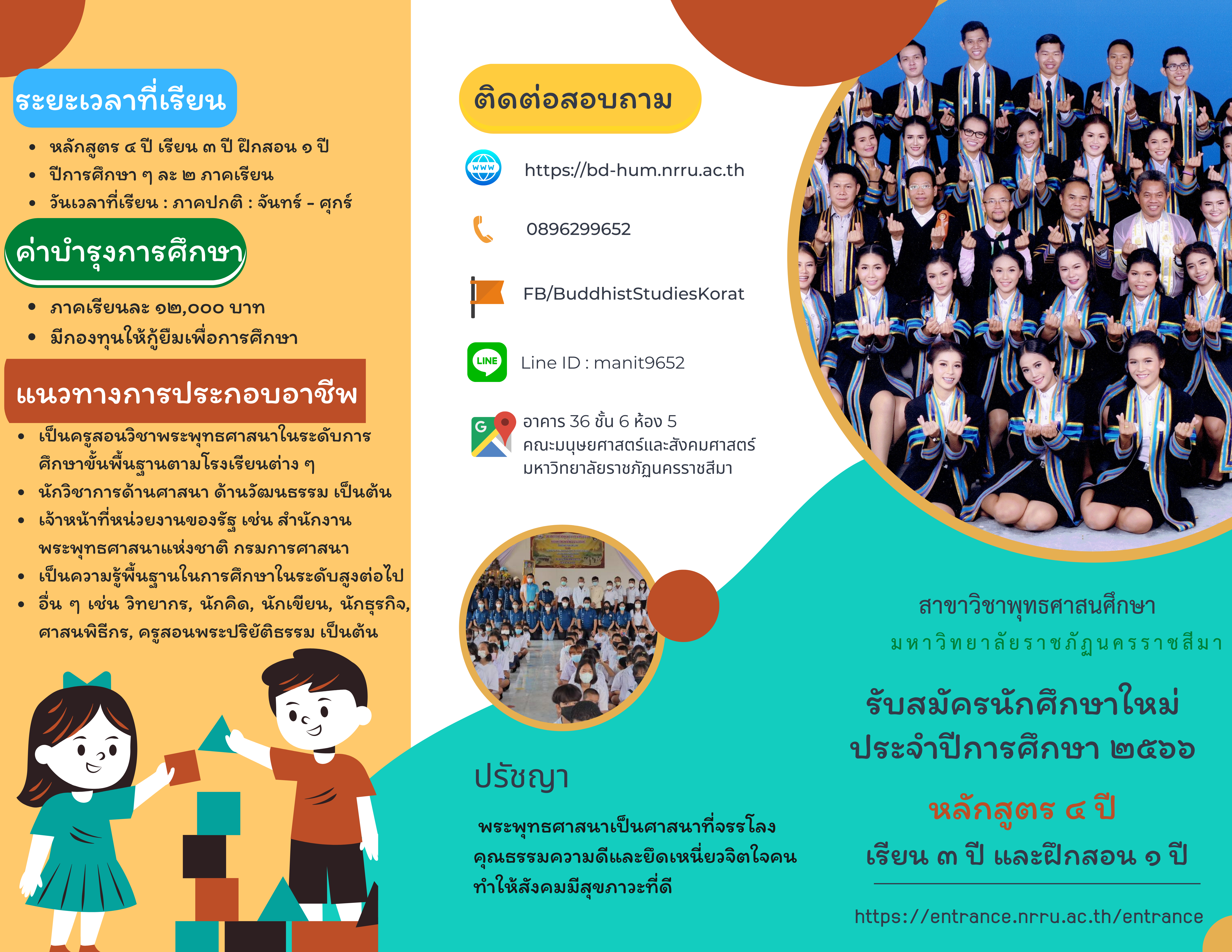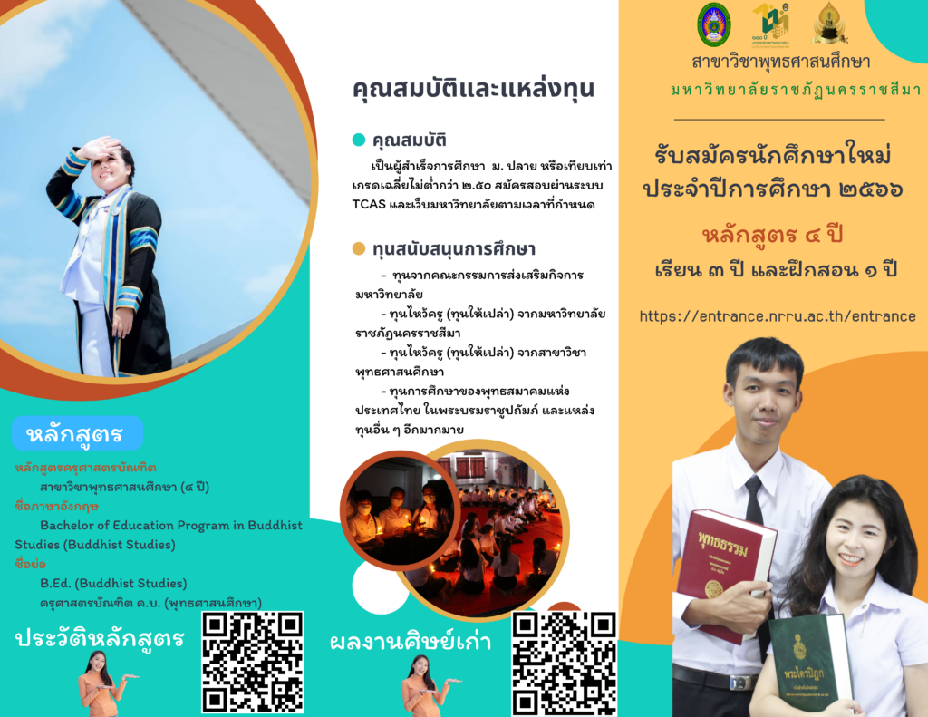 รับสมัครนักเรียนที่สำเร็จการศึกษาระดับมัธยมศึกษาปีที่ 6 หรือเทียบเท่า สมัครเข้าศึกษาต่อในหลักสูตรครุศาสตรบัณฑิต สาขาวิชาพุทธศาสนศึกษา (หลักสูตร 4 ปี) ประจำปีการศึกษา 2566 ของมหาวิทยาลัยราชภัฏนครราชสีมา