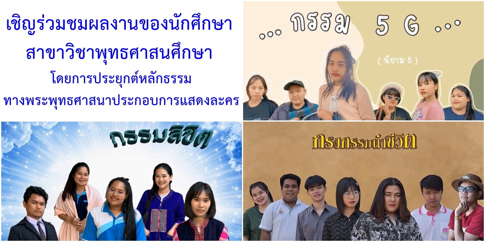 เชิญร่วมชมผลงานของนักศึกษาสาขาวิชาพุทธศาสนศึกษา ซึ่งเป็นส่วนหนึ่งของการเรียนการสอนในรายวิชาเทคโนโลยีและนวัตกรรมเพื่อการสอนพระพุทธศาสนา โดยการประยุกต์หลักธรรมทางพระพุทธศาสนาประกอบการแสดงละคร 3 เรื่อง ดังต่อไปนี้