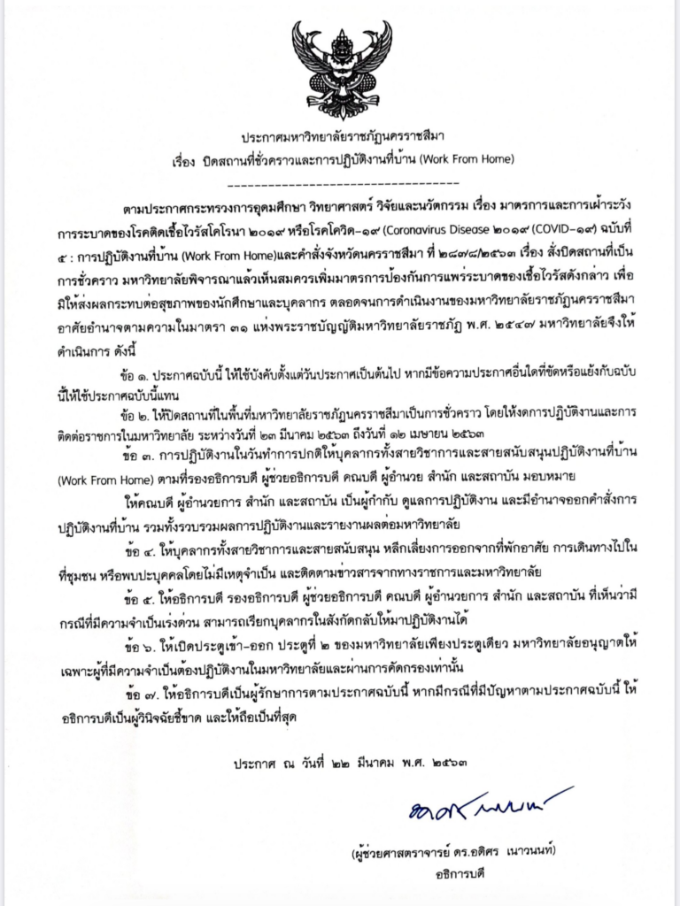 ประกาศมหาวิทยาลัยราชภัฏนครราชสีมา เรื่อง ปิดสถานที่ชั่วคราวและการปฎิบัติงานที่บ้าน แนะแนวเรื่อง ประกาศมหาวิทยาลัยราชภัฏนครราชสีมา เรื่อง เลื่อนและปรับเปลี่ยนวิธีการจัดสอบปลายภาคเรียน ๒/๒๕๖๒ (ภาคปกติ) ประกาศมหาวิทยาลัยราชภัฏนครราชสีมา เรื่อง ขยายระยะเวลาปิดสถานที่ชั่วคราวและการปฏิบัติงานที่บ้าน (Work From home)