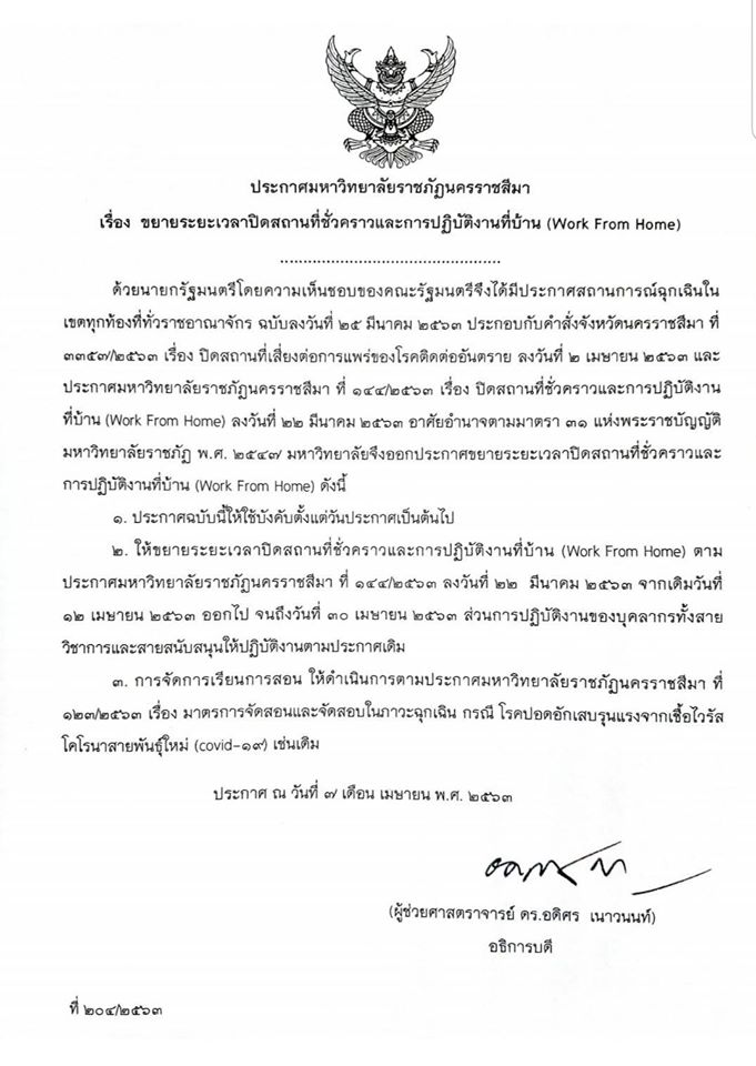 2. ให้ขยายระยะเวลาปิดสถานที่ชั่วคราวและการปฏิบัติงานที่บ้าน (Work From home) ตามประกาศมหาวิทยาลัยราชภัฏนครราชสีมา ที่ 144/2563 ลงวันที่ 22 มีนาคม 2563 จากเดิมวันที่ 12 เมษายน 2563 ออกไป จนถึงวันที่ 30 เมษายน 2563 ส่วนการปฏิบัติงานของบุคลากรทั้งสายวิชาการและสายสนับสนุนให้ปฏิบัติงานตามประกาศเดิม