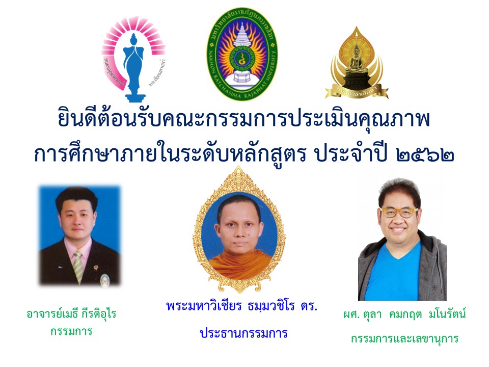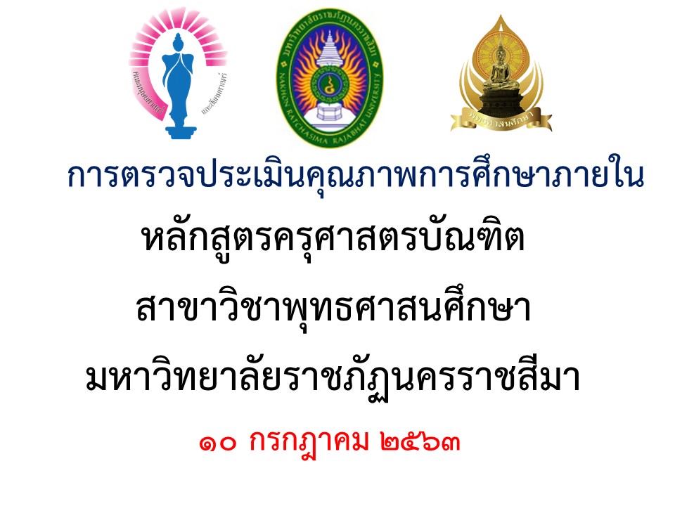 กำหนดตรวจประเมินคุณภาพการศึกษาภายในระดับหลักสูตร คณะมนุษยศาสตร์และสังคมศาสตร์ มหาวิทยาลัยราชภัฏนครราชสีมาหลักสูตรครุศาสตรบัณฑิต สาขาวิชาพุทธศาสนศึกษา ประจำปีการศึกษา 2562 โดยมีพระมหาวิเชียร ธมฺมวชิโร ดร. ผู้ทรงคุณวุฒิจากมหาวิทยาลัยมหามกุฏราชวิทยาลัย เป็นประธานกรรมการ อาจารย์เมธี กีรติอุไร คณะวิทยาการจัดการ มหาวิทยาลัยราชภัฏนครราชสีมา เป็นกรรมการ และผศ.ตุลา คมกฤต มโนรัตน์ คณะมนุษยศาสตร์และสังคมศาสตร์ มหาวิทยาลัยราชภัฏนครราชสีมา เป็นกรรมการและเลขานุการ ในการตรวจประเมินคุณภาพการศึกษาภายในระดับหลักสูตร ประจำปีการศึกษา 2562 ในวันศุกร์ ที่ 10กรกฎาคม 2563 โดยการใช้ระบบการตรวจออนไลน์