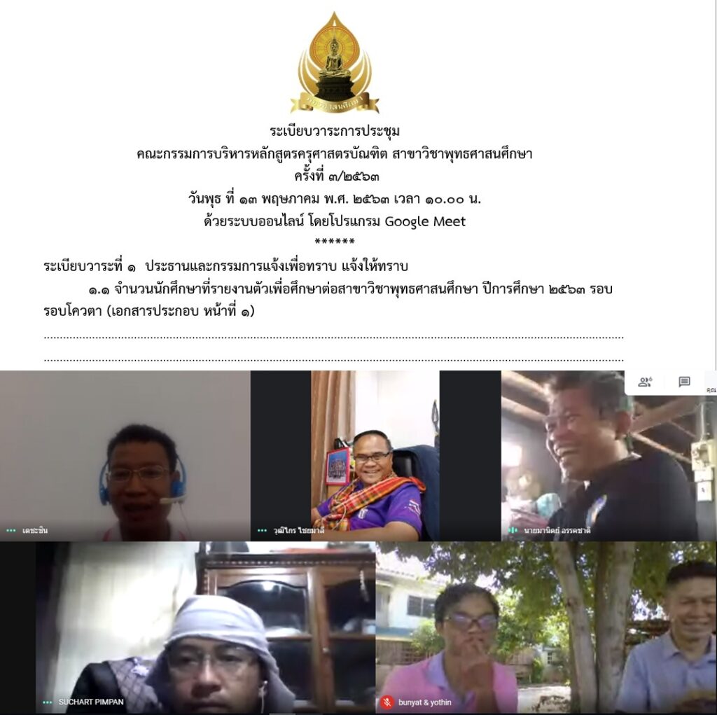 เมื่อเวลา ๑๐.๐๐ น. ของวันที่ ๑๓ พฤษภาคม ๒๕๖๓ ได้มีการประชุมคณะกรรมการบริหารหลักสูตรครุศาสตรบัณฑิต สาขาวิชาพุทธศาสนศึกษา ครั้งที่ ๓/๒๕๖๓ ด้วยระบบการประชุมออนไลน์ป้อง โดยใช้โปรแกรม Google Meet ในการประชุมออนไลน์ในครั้งนี้ โดยมีวาระการประชุมที่สำคัญหลาย ๆ อย่างในการบริหารหลักสูตรครุศาสตรบัณฑิต สาขาวิชาพุทธศาสนศึกษา ดังนี้คือ