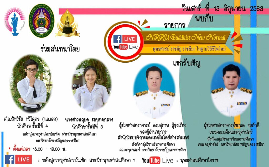 เชิญรับชมรายการสด NRRU Buddhist New Normal EP04 โดยแขกรับเชิญคือ ผู้ช่วยศาสตราจารย์ ดร.สุภาพ ผู้รุ่งเรือง รองผู้อำนวยการสำนักวิทยบริการ และอาจารย์ประจำกลุ่มวิชาบริหารการศึกษา มหาวิทยาลัยราชภัฏนครราชสีมา และ ผู้ช่วยศาสตราจารย์ชยพล ธงภักดี รองคณบดีฝ่ายพัฒนานักศึกษาและวิเทศสัมพันธ์ คณะครุศาสตร์ และอาจารย์ประจำกลุ่มวิชาการวัดผลการศึกษา มหาวิทยาลัยราชภัฏนครราชสีมา ในวันเสาร์ ที่ 13 มิ.ย. 63 ตั้งแต่เวลา 18.00 – 19.00 น. ในหัวข้อ “มุมมองอาจารย์ผู้สอนต่อนักศึกษาสาขาวิชาพุทธศาสนศึกษา” ดำเนินรายการโดยนายสิทธิชัย ทวีโคตร นักศึกษาชั้นปีที่ 4 และนางสาวนฤมล ชอบทดกลาง นักศึกษาชั้นปีที่ 3 หลักสูตรครุศาสตรบัณฑิต สาขาวิชาพุทธศาสนศึกษา โดยจะออกกาศทางหน้าเพจหลักสูตรครุศาสตรบัณฑิต สาขาวิชาพุทธศาสนศึกษา มหาวิทยาลัยราชภัฏนครราชสีมา และทางยูทูป พุทธศาสนศึกษา โคราช