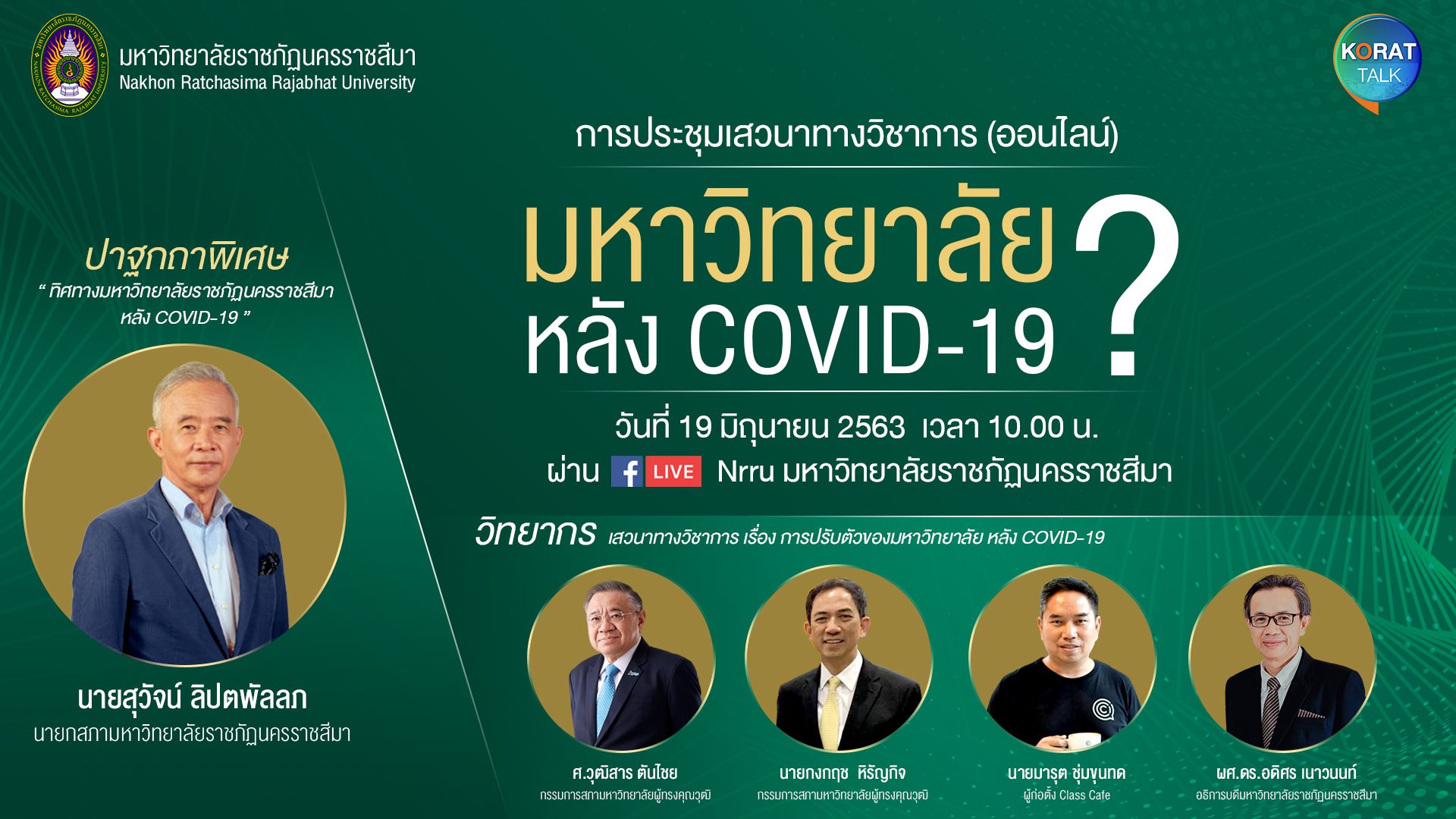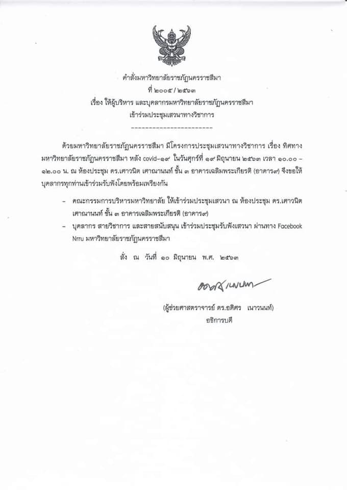 ด้วยมหาวิทยาลัยราชภัฏนครราชสีมาของพวกเราจะมีการปรับยุทธศาสตร์หลัง COVID19 ขอเชิญบุคลากรทุกท่านเข้าร่วมรับฟังโดยพร้อมเพรียงกัน เพื่อให้คณะ/สำนัก/สถาบันได้เตรียมการปรับยุทธศาสตร์ของหน่วยงานต่อไป ในวันที่ 19 มิถุนายนนี้ เวลา 10:00 น. -12:00 น. พบกับปาฐกถาพิเศษ โดย นายสุวัจน์ ลิปพัลลภ นายกสภามหาวิทยาลัยราชภัฏนครราชสีมา การเสวนา โดย ศ.วุฒิสาร ตันชัย กรรมการสภามหาวิทยาลัยผู้ทรงคุณวุฒิ นายกงกฤช หิรัญกิจ สภามหาวิทยาลัยผู้ทรงคุณวุฒิ นายมารุต ชุ่มขุนทด ผู้ก่อตั้ง Class Cafe และ ผศ.ดร.อดิศร เนาวนนท์ อธิการบดีมหาวิทยาลัยราชภัฏนครราชสีมา พบกันทาง Facebook Live จากเพจ Nrru มหาวิทยาลัยราชภัฏนครราชสีมา ส่วนคณะกรรมการบริหารมหาวิทยาลัยให้มาร่วมประชุมเสวนา ณ ห้องประชุม ดร.เศาวนิต เศณานนท์ ช้้น 3 อาคารเฉลิมพระเกียรติ (อาคาร 9)