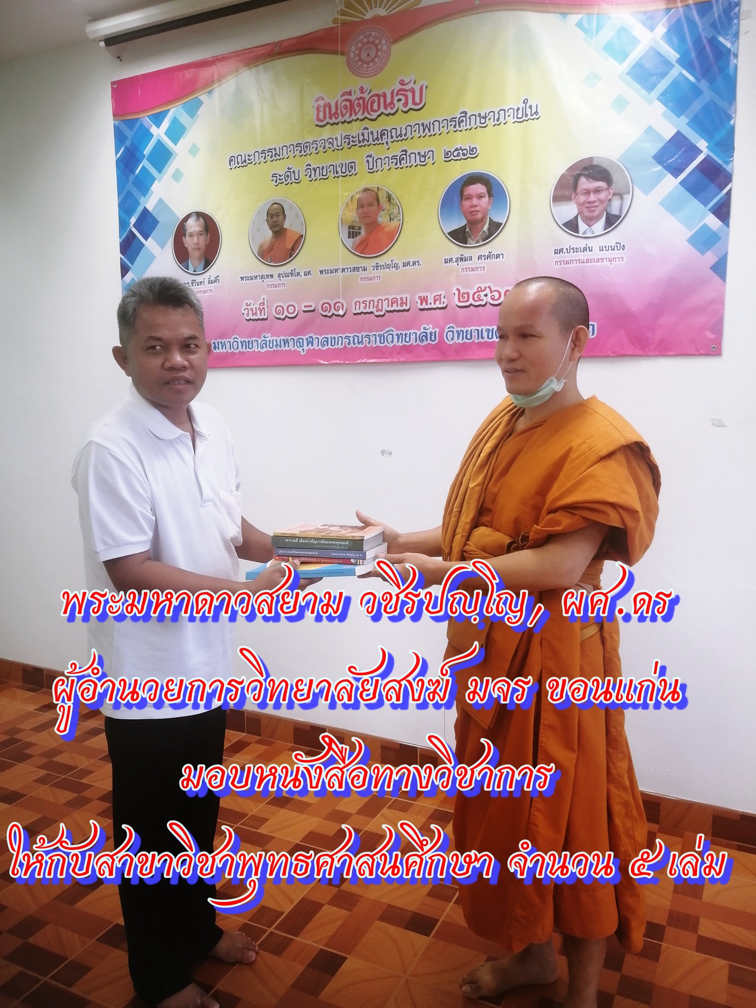 ในโอกาสนี้ทางหลักสูตรครุศาสตรบัณฑิต สาขาวิชาพุทธศาสนศึกษา ต้องกราบนมัสการขอบพระคุณท่านพระมหาดาวสยาม วชิรปญฺโญ, ผศ.ดร ผู้อำนวยการวิทยาลัยสงฆ์ มจร ขอนแก่น ได้มอบหนังสือทางวิชาการให้กับสาขาวิชา ซึ่งสาขาวิชาจะได้ไปใช้ให้เกิดประโยชน์ต่อกิจกรรมการเรียนการสอนในหลักสูตรครุศาสตรบัณฑิต สาขาวิชาพุทธศาสนศึกษาต่อไป