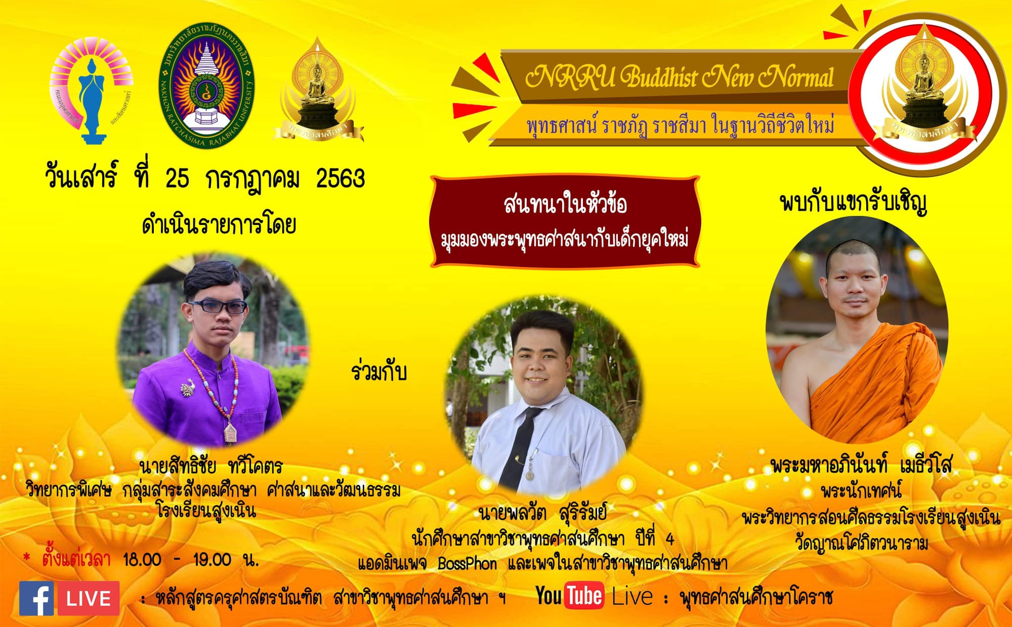 เชิญรับชมรายการสด NRRU Buddhist New Normal EP10 โดยแขกรับเชิญคือ พระมหาอภินันท์ เมธีวํโส พระวิทยากร, พระสอนศีลธรรมโรงเรียนสูงเนิน วัดญาณโศภิตวนาราม ซึ่งจะออกอากาศในวันเสาร์ ที่ 25 ก.ค. 63 ตั้งแต่เวลา 18.00 – 19.00 น. ในหัวข้อ “มุมมองพระพุทธศาสนากับเด็กยุคใหม่” ดำเนินรายการโดย นายสิทธิชัย ทวีโคตร วิทยากร กลุ่มสาระสังคมศึกษา ศาสนาและวัฒนธรรม โรงเรียนสูงเนิน และนายพลวัต สุริรัมย์ นักศึกษาชั้นปีที่ 4 สาขาวิชาพุทธศาสนศึกษา แอดมินเพจ BossPhon และเพจในสาขาวิชาพุทธศาสนศึกษา โดยจะออกกาศทางหน้าเพจหลักสูตรครุศาสตรบัณฑิต สาขาวิชาพุทธศาสนศึกษา มหาวิทยาลัยราชภัฏนครราชสีมา และทางยูทูป พุทธศาสนศึกษา โคราช