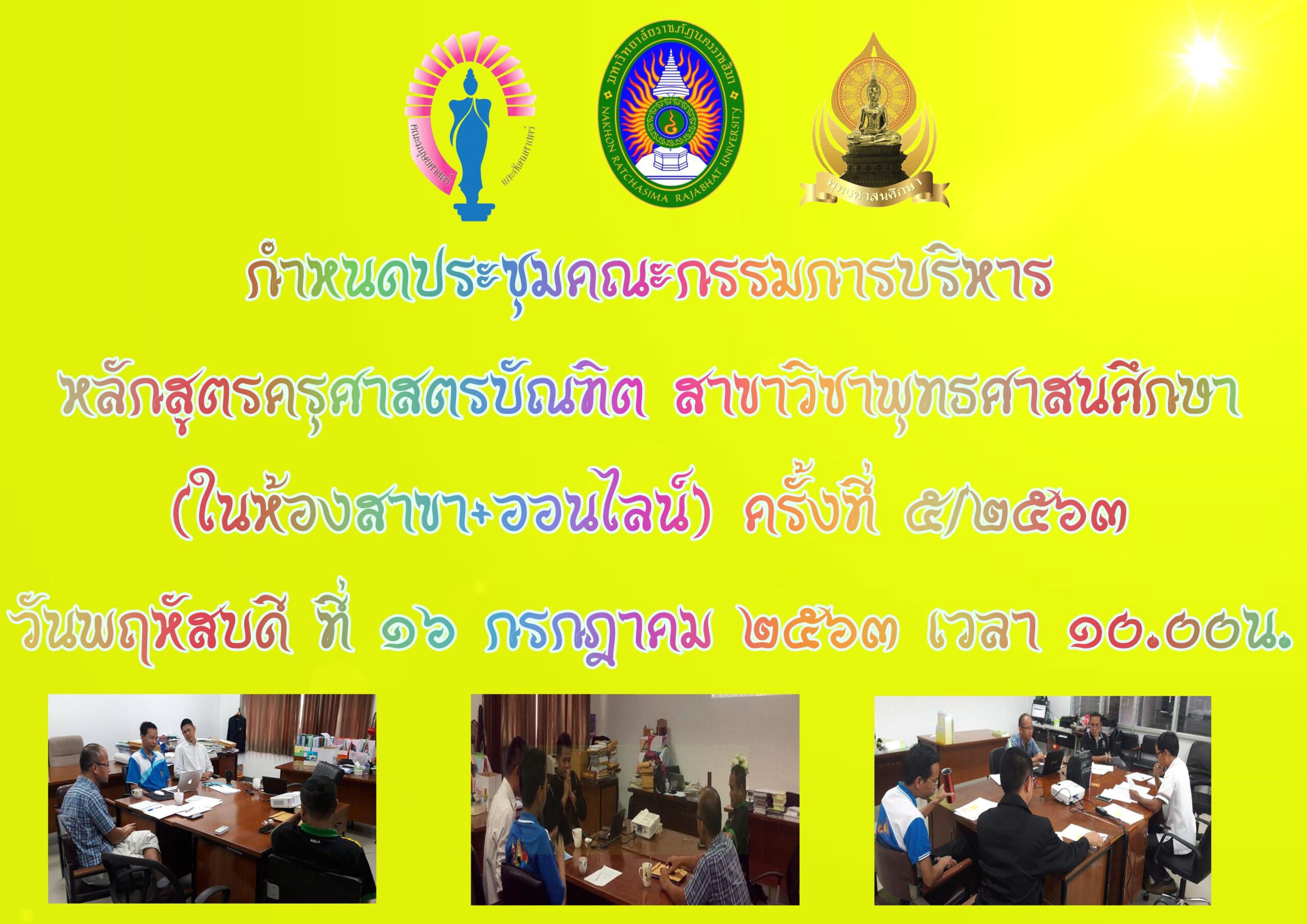 ด้วยหลักสูตรครุศาสตรบัณฑิต สาขาวิชาพุทธศาสนศึกษา คณะมนุษยศาสตร์และสังคมศาสตร์ มหาวิทยาลัยราชภัฎนครราชสีมา มีข้อราชการจะประชุมปรึกษาหารือในการประชุมคณะกรรมการบริหารหลักสูตรครุศาสตรบัณฑิต สาขาวิชาพุทธศาสนศึกษา ครั้งที่ ๕/๒๕๖๓ ในวันพฤหัสบดี ที่ ๑๖ กรกฎาคม ๒๕๖๓ ตั้งแต่เวลา ๑๐.๐๐ น. เป็นต้นไป ณ ห้องสาขาวิชาพุทธศาสนศึกษา อาคาร ๓๖ ชั้น ๖ ห้อง ๕ (๓๖.๐๖.๐๕) อาคารคณะมนุษยศาสตร์และสังคมศาสตร์ มหาวิทยาลัยราชภัฏนครราชสีมา และประชุมออนไลน์โดยใช้แอพพลิเคชั่นไลน์ MS Teams ของสาขาวิชา สำหรับท่านที่ไม่สะดวกเข้าห้องประชุมแบบธรรมดา