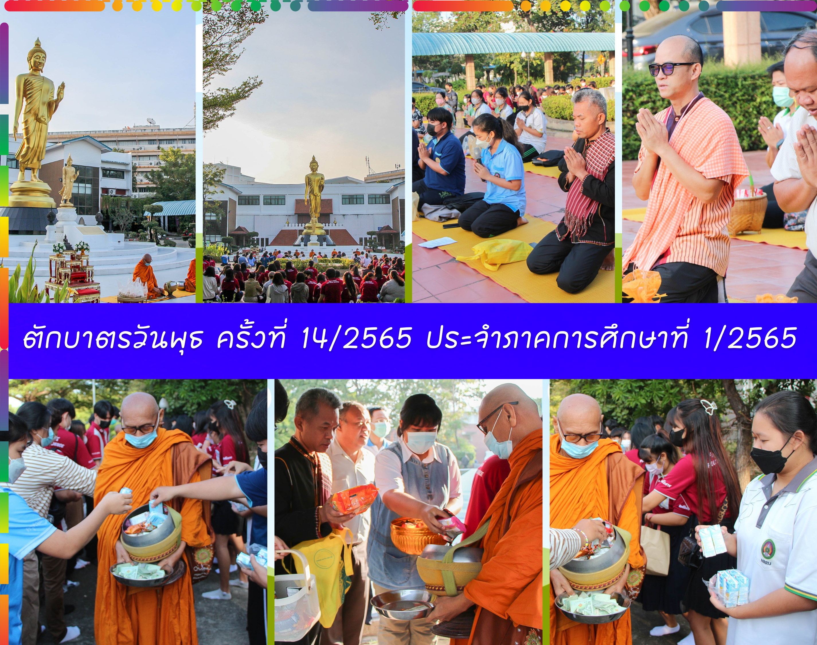 เมื่อเวลา 07.00 น. ของวันพุธที่ 9 ตุลาคม 2565 (แรม 1 ค่ำ เดือน 12 ปีขาล) ณ ลานธรรมเฉลิมพระเกียรติ มหาวิทยาลัยราชภัฏนครราชสีมา ได้มีการจัดกิจกรรมตักบาตรวันพุธ (ครั้งที่ 14) ภาคการศึกษาที่ 1 ประจำปีการศึกษา 2565 โดยมีคณาจารย์ บุคลากรและนักศึกษาของมหาวิทยาลัยราชภัฏนครราชสีมา เข้าร่วมสวดมนต์ไหว้พระ สมาทานศีล ฟังธรรม เป็นกิจกรรมที่ส่งเสริมคุณธรรมจริยธรรม เพื่อพัฒนาคุณภาพชีวิตและสังคม ด้วยหลักธรรมคำสอนทางพระพุทธศาสนาให้แก่นักศึกษาและบุคลากรของมหาวิทยาลัยราชภัฏนครราชสีมา ซึ่งจัดโดยสำนักศิลปะและวัฒนธรรม มหาวิทยาลัยราชภัฏนครราชสีมา ซึ่งครั้งนี้ได้รับเกียรติจากท่านผู้ช่วยศาสตราจารย์ ดร.ปิยะนันท์ ทรงสุนทรวัฒน์ ประธานหลักสูตรสาขาวิชารัฐศาสตร์ คณะมนุษยศาสตร์และสังคมศาสตร์ มหาวิทยาลัยราชภัฏนครราชสีมา เป็นประธานจุดธูปเทียนบูชาพระรัตนตรัย และตักบาตรข้าวสารอาหารแห้ง ร่วมกับคณาจารย์ บุคลากร และนักศึกษา โดยมีนางสาวกัลยา คงน้ำ นักศึกษาสาขาวิชาพุทธศาสนศึกษา ชั้นปีที่ 3 เป็นผู้นำไหว้พระ สวดมนต์ อาราธนาศีล ร่วมทั้งเป็นต้นเสียงในการถวายสังฆทาน ก่อนจะที่ได้ร่วมตักบาตรข้าวสารอาหารแห้งแด่พระสงฆ์ นำโดยพระครูศีลวราภรณ์ เจ้าอาวาสวัดโนนเมือง พร้อมด้วยคณะสงฆ์จำนวน 5 รูป มาเป็นเนื้อนาบุญในการทำบุญตักบาตรในครั้งนี้ ซึ่งมีคณาจารย์ บุคลากร และนักศึกษาจากคณะต่าง ๆ เข้าร่วมกิจกรรมการตักบาตรดังกล่าวด้วย