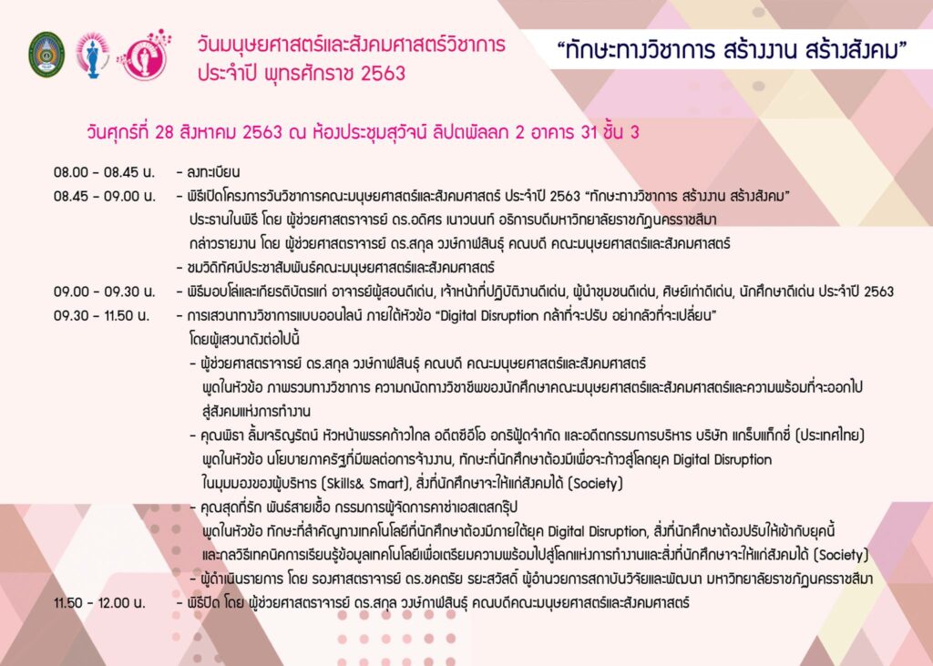 ตามที่คณะมนุษยศาสตร์และศาสตร์ มหาวิทยาลัยราชภัฏนครราชสีมา ได้กำหนดจัด โครงการวันวิชาการคณะมนุษยศาสตร์และสังคศาสตร์ ประจำปี ๒๕๖๓ ในหัวข้อ “ทักษะทางวิชาการ สร้างงาน สร้างสังคม” ให้แก่นักศึกษาสังกัดคณะมนุษยศาสตร์และสังคมศาสตร์และนักศึกษาหลักสูตรครุศาสตรบัณฑิต สาขาวิชานาฏศิลป์ไทย สาขาวิชาภาษาไทย สาขาวิชาภาษาอังกฤษ สาขาวิชาดนตรี สาขาวิชาศิลปศึกษา สาขาวิชาสังคมศึกษา และสาขาวิชาพุทธศาสนศึกษา โดยจัดเสวนาทางวิชาการเพื่อเตรียมความพร้อมให้ระหว่างคณาจารย์และนักศึกษาออกไปสู่โลกกว้าง พร้อมทั้งเปิดโอกาสให้มีการแลกเปลี่ยนเรียนรู้ระหว่างอาจารย์และนักศึกษา นักศึกษานอกเหนือจากการเรียนในชั้นเรียนและได้แสดงออกถึงความความสามารถทางวิชาการ เพื่อฝึกทักษะด้านวิชาการ การให้บริการวิชาการ การพัฒนาทักษะ ได้เรียนมุมมองใหม่ๆ ในการเรียนรู้เทคโนโลยีและองค์ความรู้ในการเตรียมความพร้อมสู่การทำงานมืออาชีพ ตลอดจนการร่วมเสวนาผ่านระบบออนไลน์ (โปรแกม Zoom) จากบุคคลต้นแบบที่ประสบความสำเร็จในอาชีพและการใช้เทคโนโลยี ทั้งยังมีการพิจารณามอบรางวัลแต่ผู้ที่มีความเหมาะสมทางด้าน อาจารย์ผู้สอนดีเด่น ศิษย์เก่าดีเด่นผู้ปฏิบัติงานสายสนับสนุนดีเด่นและนักศึกษาดีเด่น ตามเกณฑ์ของคณะมนุษยศาสตร์และสังคมศาสตร์ ในวันที่ ๒๘ สิงหาคม ๒๕๖๓ ณ ห้องสุวัจน์ลิตพัลลภ ๒ (อาคาร ๓๑ชั้น ๓) มหาวิทยาลัยราชภัฏสีมา เนื่องจากสถานการณ์การระบาดของโรด COVID -๑๙ จึงมีความจำเป็นอย่างยิ่งที่คณะมนุษยศาสตร์และสังคมศาสตร์ต้องปรับเปลี่ยนรูปแบบการจัดงานโดยกำหนดจำนวนผู้เข้าร่วมโครงกร และจัดงานเสวนาทางวิชการให้เป็นแบบออนไลน์ คณะมนุษยศาสตร์และสังคมศาสตร์ได้ตระหนักถึงความสำคัญในสถานการณ์นี้จึงได้จัดเตรียมมาตรการคัดกรอง และจัดสถานที่เพื่อเตรียมความพร้อม ดังนั้นเพื่อให้การดำเนินงานโครงการเป็นไปด้วยความเรียบร้อยและบรรลุวัตถุประสงค์อย่างมีประสิทธิภพ เชิญชวนคณาจารย์ ศิษย์เก่า ศิษย์ปัจจุบัน และผู้ที่สนใจทั่วไปร่วมกิจกรรม โดยมีกิจกรรมมากมายหลายอย่าง เช่น การบรรยายวิชาการ มีการมอบรางวัลให้แก่ ผู้นำชุมชนดีเด่น อาจารย์ดีเด่น เจ้าหน้าที่ดีเด่น ศิษย์เก่าดีเด่น และนักศึกษาดีเด่น พร้อมกิจกรรมต่าง ๆ อีกมากมายหลายอย่าง โทรสอบถามรายละเอียด ๐๔๔๐๐๙๐๐๙ ต่อ ๓๖๒๔