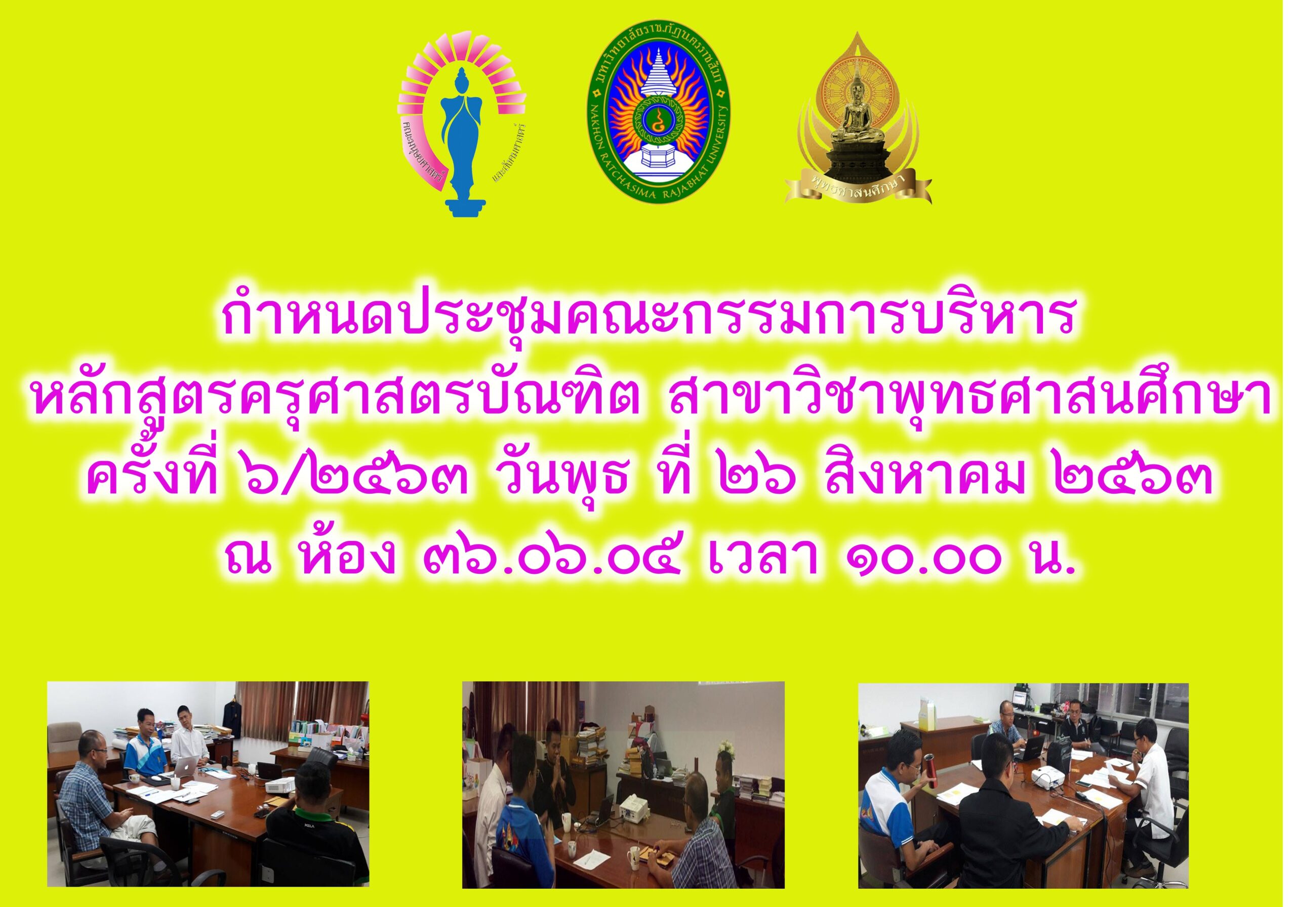 ด้วยหลักสูตรครุศาสตรบัณฑิต สาขาวิชาพุทธศาสนศึกษา คณะมนุษยศาสตร์และสังคมศาสตร์ มหาวิทยาลัยราชภัฎนครราชสีมา มีข้อราชการจะประชุมปรึกษาหารือในการประชุมคณะกรรมการบริหารหลักสูตรครุศาสตรบัณฑิต สาขาวิชาพุทธศาสนศึกษา ครั้งที่ ๖/๒๕๖๓ ในวันพุธที่ ๒๖ สิงหาคม ๒๕๖๓ ตั้งแต่เวลา ๑๐.๐๐ น. เป็นต้นไป ณ ห้องสาขาวิชาพุทธศาสนศึกษา อาคาร ๓๖ ชั้น ๖ ห้อง ๕ (๓๖.๐๖.๐๕) อาคารคณะมนุษยศาสตร์และสังคมศาสตร์ มหาวิทยาลัยราชภัฏนครราชสีมา และประชุมออนไลน์โดยใช้แอพพลิเคชั่นไลน์ MS Teams ของสาขาวิชา สำหรับกรรมการที่ไม่สะดวกเข้าห้องประชุมแบบธรรมดา