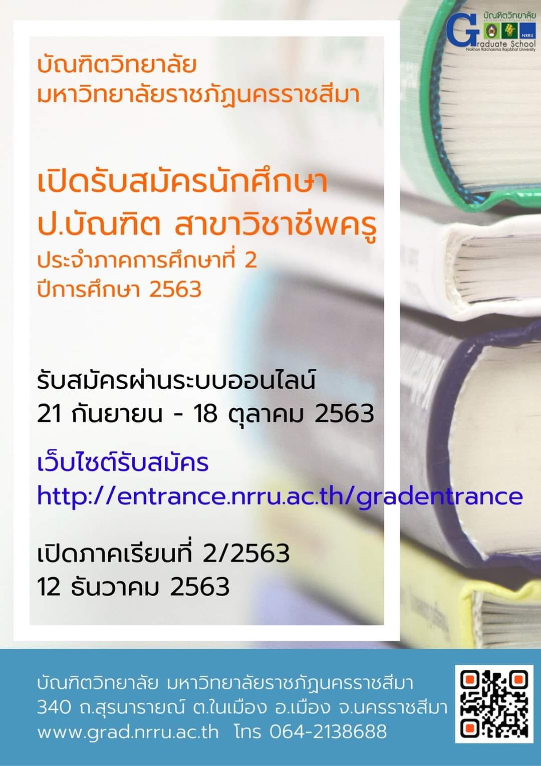 บัณฑิตวิทยาลัย มหาวิทยาลัยราชภัฏนครราชสีมา เปิดรับสมัครสอบคัดเลือกเข้าศึกษาต่อหลักสูตรประกาศนียบัตรบัณฑิต สาขาวิชาชีพครู (ป.บัณฑิต)