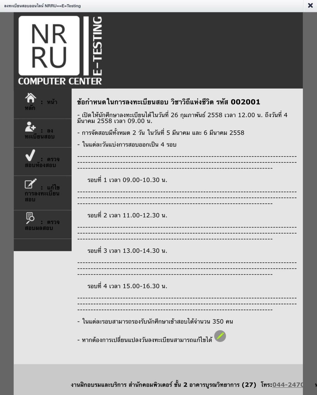 โปรแกรมวิชาปรัชญา ศาสนาและเทววิทยา คณะมนุษยศาสตร์และสังคมศาสตร์ มหาวิทยาลัยราชภัฏนครราชสีมา จัดสอบด้วยระบบออนไลน์ ในรายวิชาวิถีแห่งชีวิต ซึ่งเป็นวิชาพื้นฐานที่มีนักศึกษาลงทะเบียนเรียนในแต่ละเทอมเป็นจำนวนมาก ฉะนั้นเพื่อความสะดวกของผู้คุมสอบและนักศึกษาที่จะสอบด้วย จึงได้ใช้ระบบการสอบออนไลน์ โดยเริ่มเป็นครั้งแรกในเทอม ๒/๒๕๕๗ เป็นต้นไป โดยนักศึกษาสามารถลงทะเบียนสอบได้ตามลิงค์นี้ http://www.ittrain.nrru.ac.th/etest58/index.php
