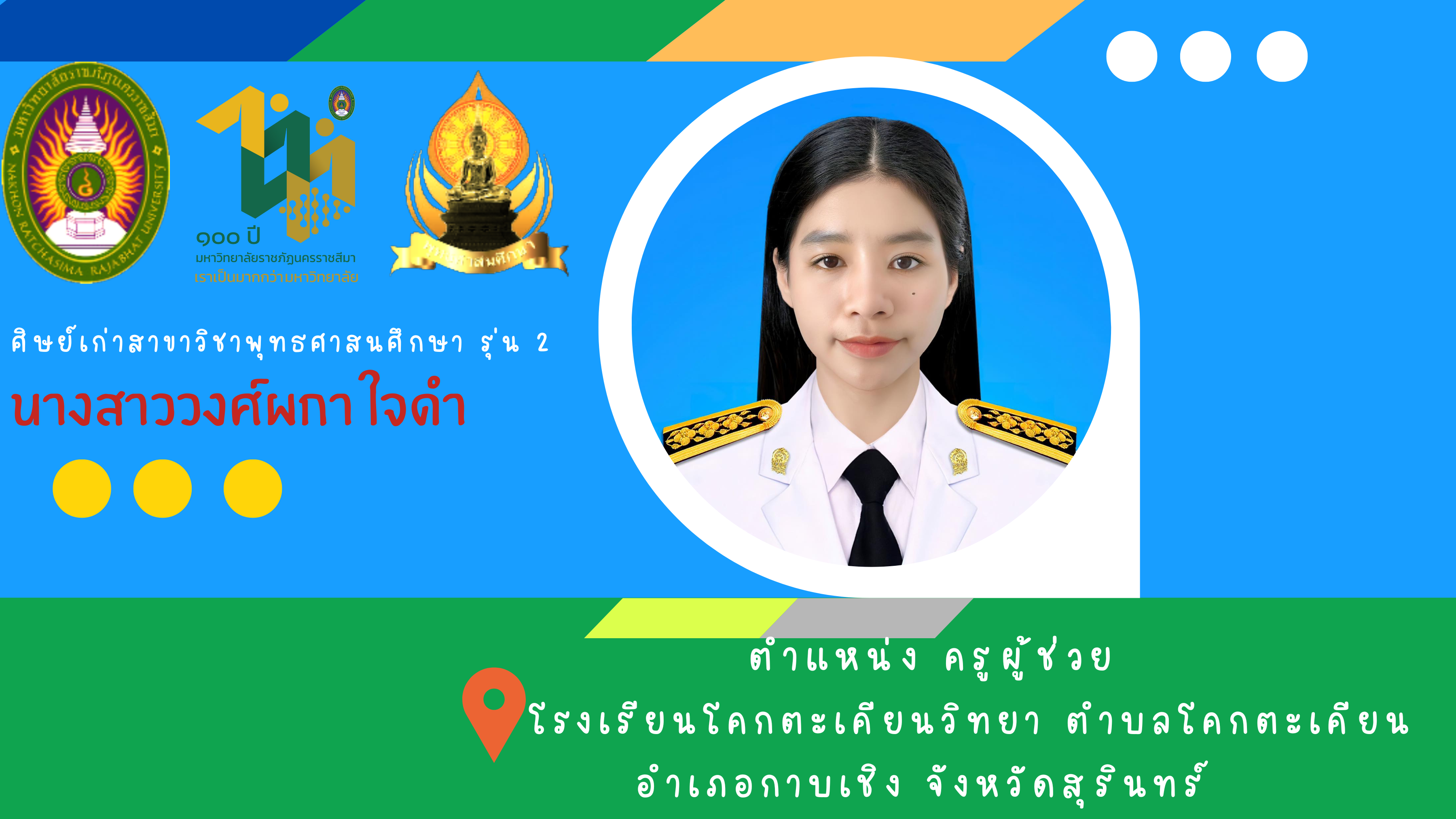 สาขาวิชาพุทธศาสนศึกษา มหาวิทยาลัยราชภัฏนครราชสีมา ขอแสดงความยินดีกับนางสาววงศ์ผกา ใจดำ (ครูปุ๊ก) ศิษย์เก่าสาขาวิชาพุทธศาสนศึกษา ที่ได้รับการบรรจุและแต่งตั้งจากการสอบแข่งขันได้ เพื่อบรรจุและแต่งตั้งบุคคลเข้ารับราชการ เป็นข้าราชการครูและบุคลากรทางการศึกษา ตำแหน่งครูผู้ช่วย สำนักงานศึกษาธิการจังหวัดนครราชสีมา ซึ่งไปขึ้นบัญชีผู้สอบแข่งขันได้ของคณะกรรมการศึกษาธิการจังหวัดสุรินทร์ เลือกบรรจุเป็นข้าราชการครู ณ โรงเรียนโคกตะเคียนวิทยา ตำบลโคกตะเคียน อำเภอกาบเชิง จังหวัดสุรินทร์ สำนักงานเขตพื้นที่การศึกษามัธยมศึกษาสุรินทร์ โดยกำหนดรายงานตัวในวันที่ 10 พฤษภาคม 2566 ณ กลุ่มบริหารงานบุคคล สำนักงานเขตพื้นที่การศึกษามัธยมศึกษาสุรินทร์ เลขที่ 197 หมู่ที่ 20 ตำบลนอกเมือง อำเภอเมืองสุรินทร์ จังหวัดสุรินทร์ และจะปฏิบัติหน้าที่เป็นคุณครูประจำโรงเรียนโคกตะเคียนวิทยา ตำบลโคกตะเคียน อำเภอกาบเชิง จังหวัดสุรินทร์ ต่อไป