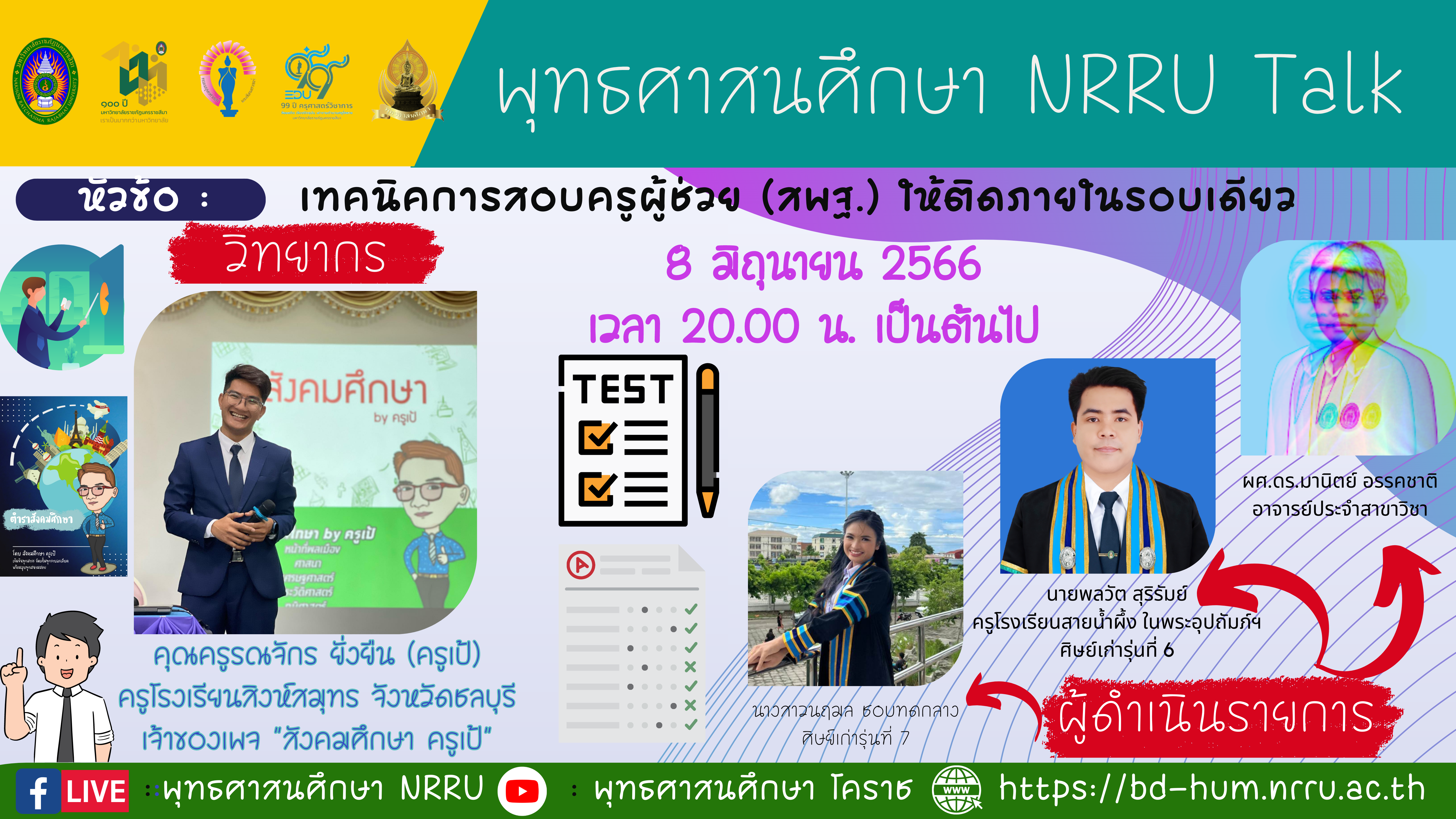 สาขาวิชาพุทธศาสนศึกษา คณะครุศาสตร์ มหาวิทยาลัยราชภัฏนครราชสีมา ขอเชิญทุกท่านรับชมรายการสด พุทธศาสนศึกษา NRRU Talk ep.10 หัวข้อ “เทคนิคการสอบครูผู้ช่วย(สพฐ.) ให้ติดภายในรอบเดียว” ออกอากาศในวันพฤหัสบดีที่ 8 มิถุนายน 2566 เวลา 20.00 น. เป็นต้นไป ผ่านทาง Facebook fanpage : พุทธศาสนศึกษา NRRU และทาง YouTube channel พุทธศาสนศึกษา โคราช โดยสาขาวิชาได้เรียนเชิญคุณครูรณจักร ยั่งยืน (ครูเป้) จากโรงเรียนสิงห์สมุทร จังหวัดชลบุรี และเป็นเจ้าของเพจ “สังคมศึกษา ครูเป้” มาเป็นวิทยากรให้ความรู้